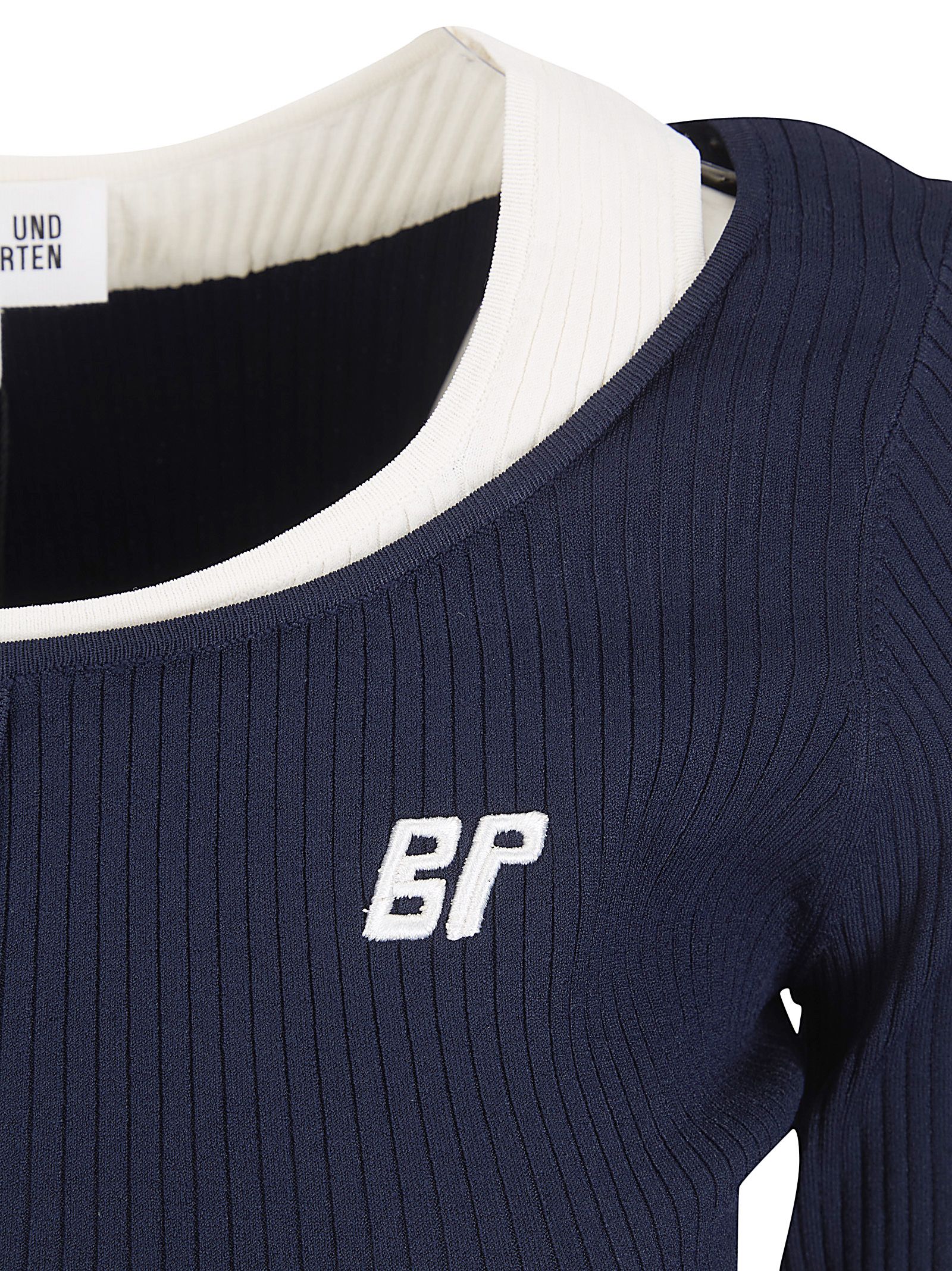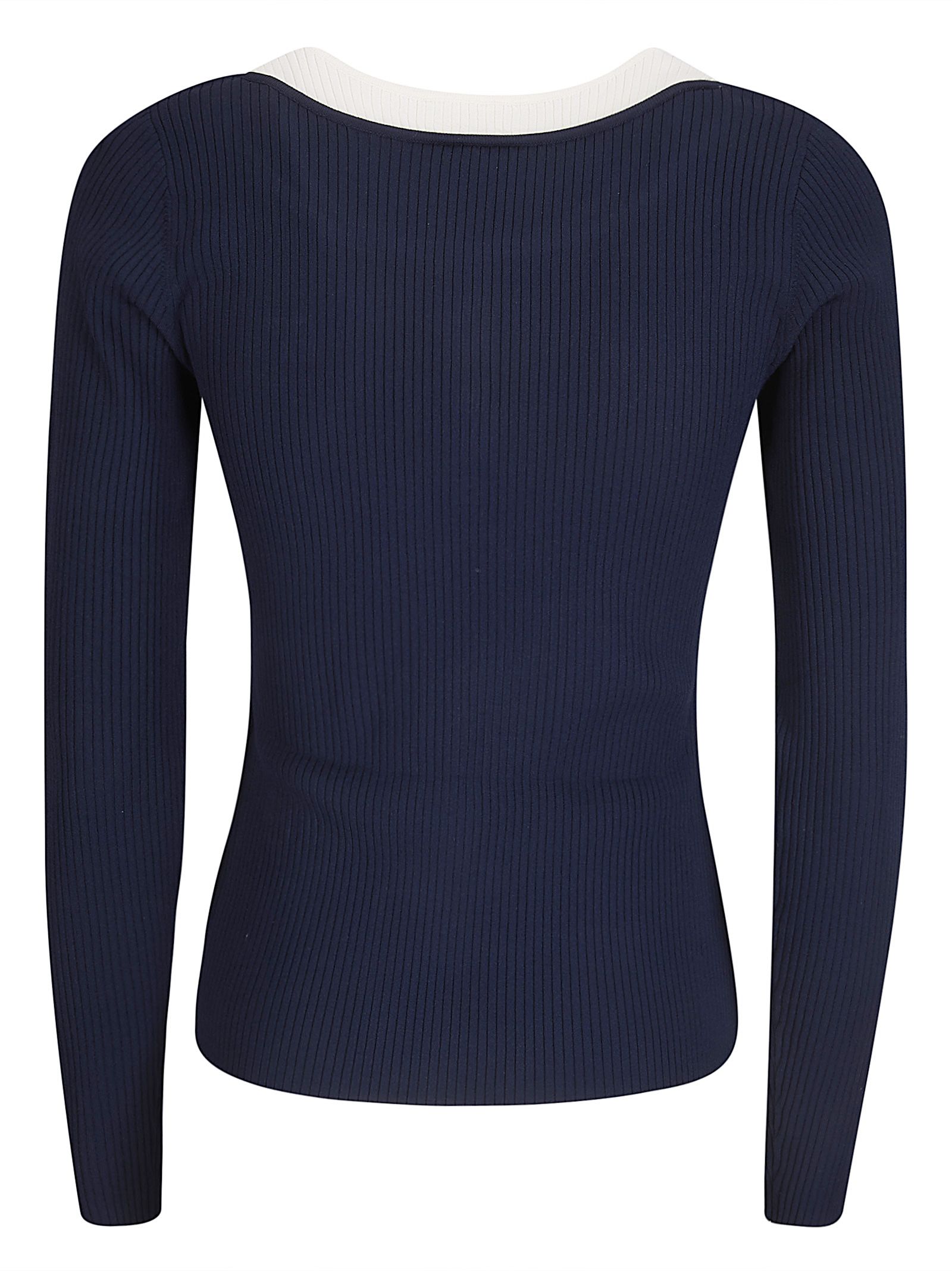 Top in tessuto a costine, slim fit, collo ampio con contrasto bianco.