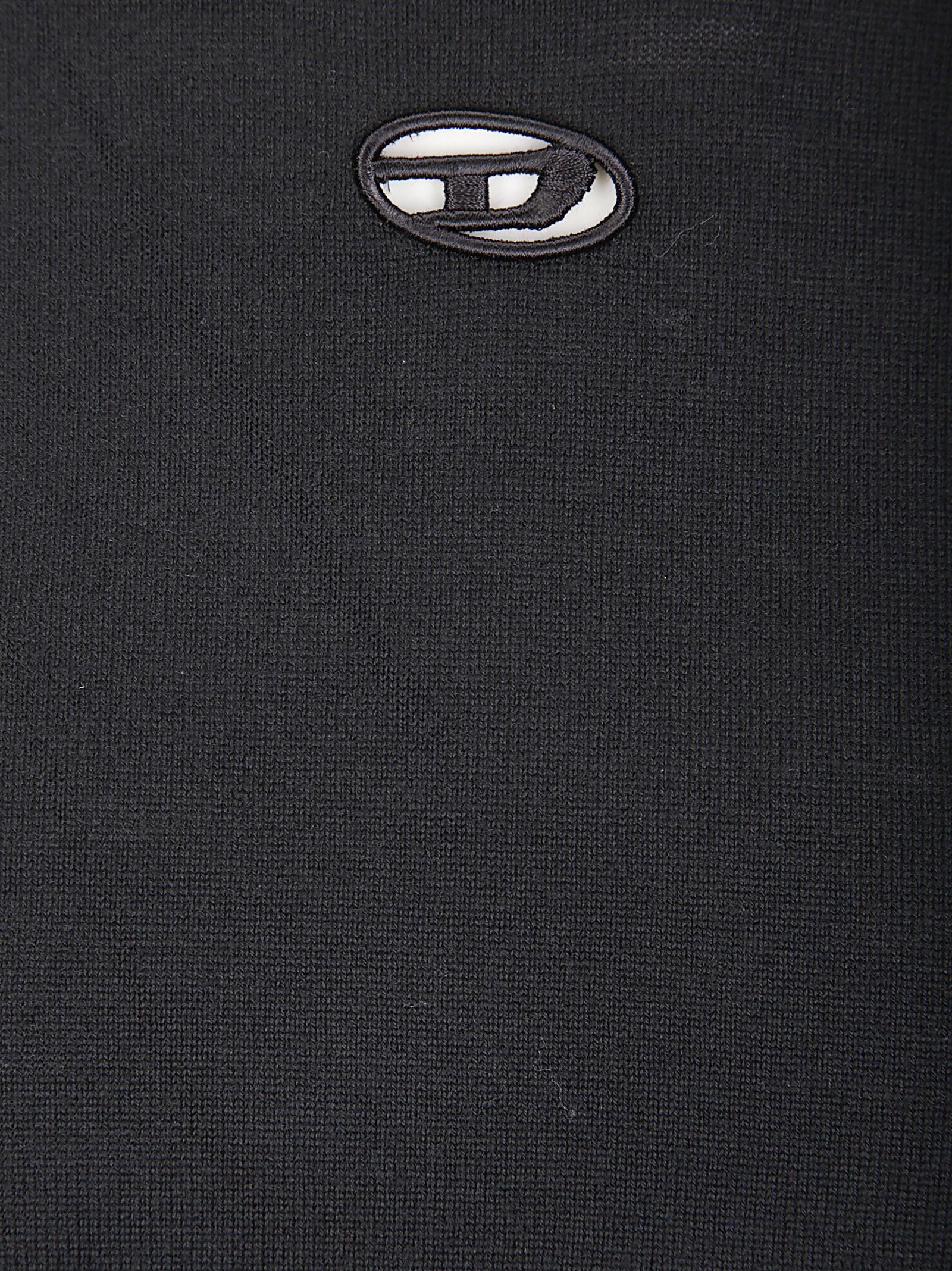 Pull en laine col rond, coupe slim, application logo sur la poitrine, détail découpe.
