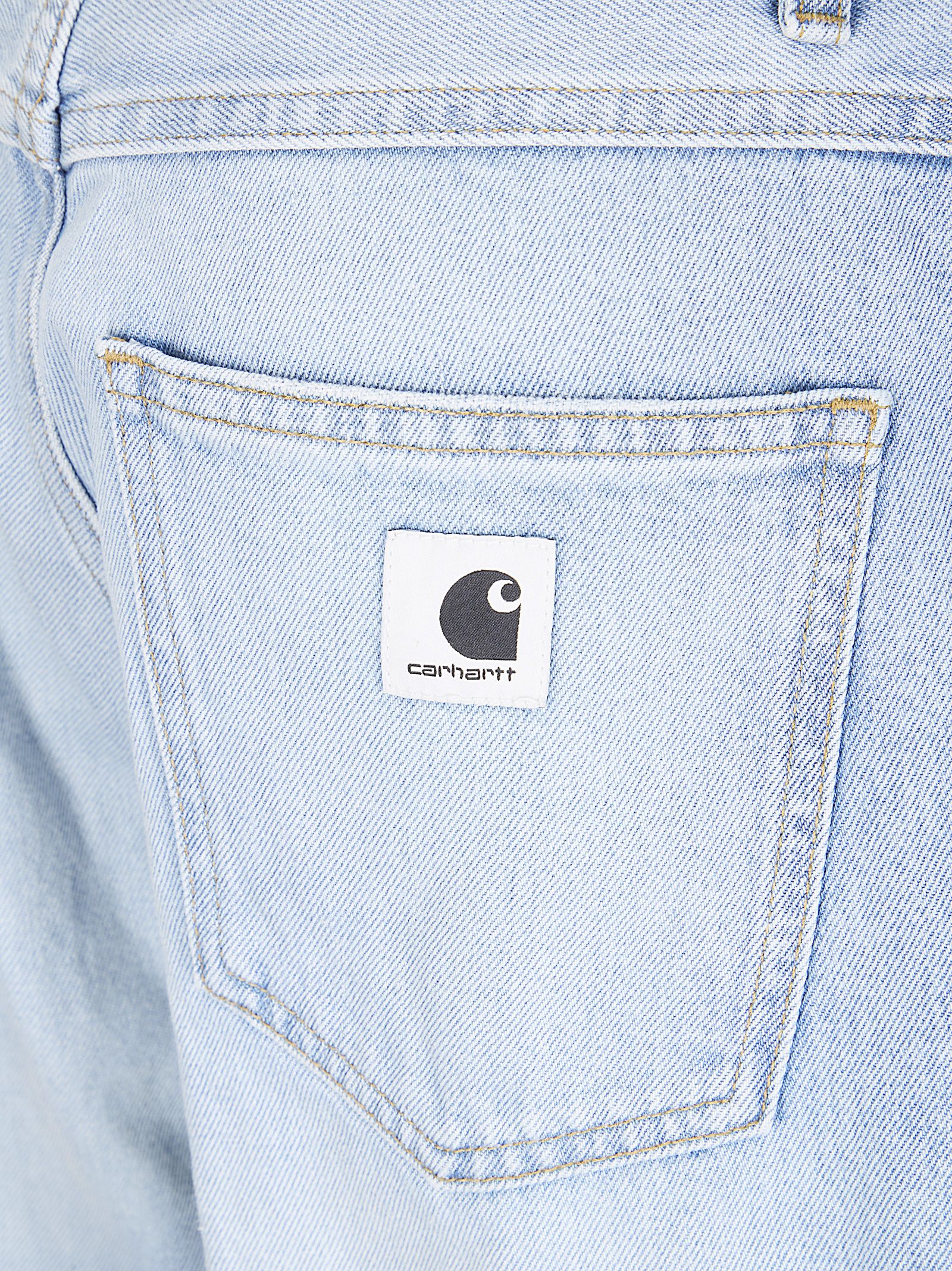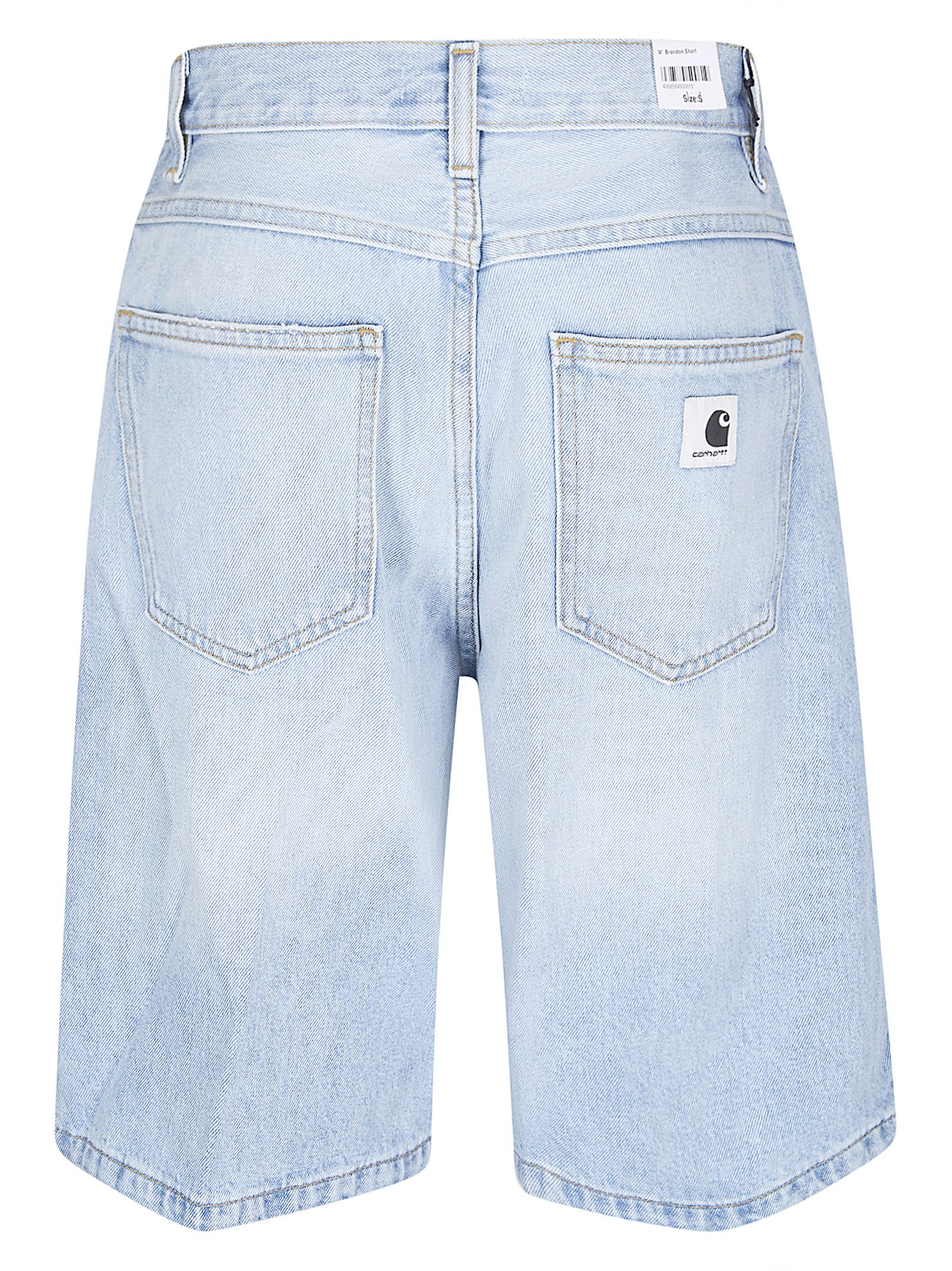 Pantaloni denim corti, cinque tasche, vestibilità ampia, logo applicato sul retro.