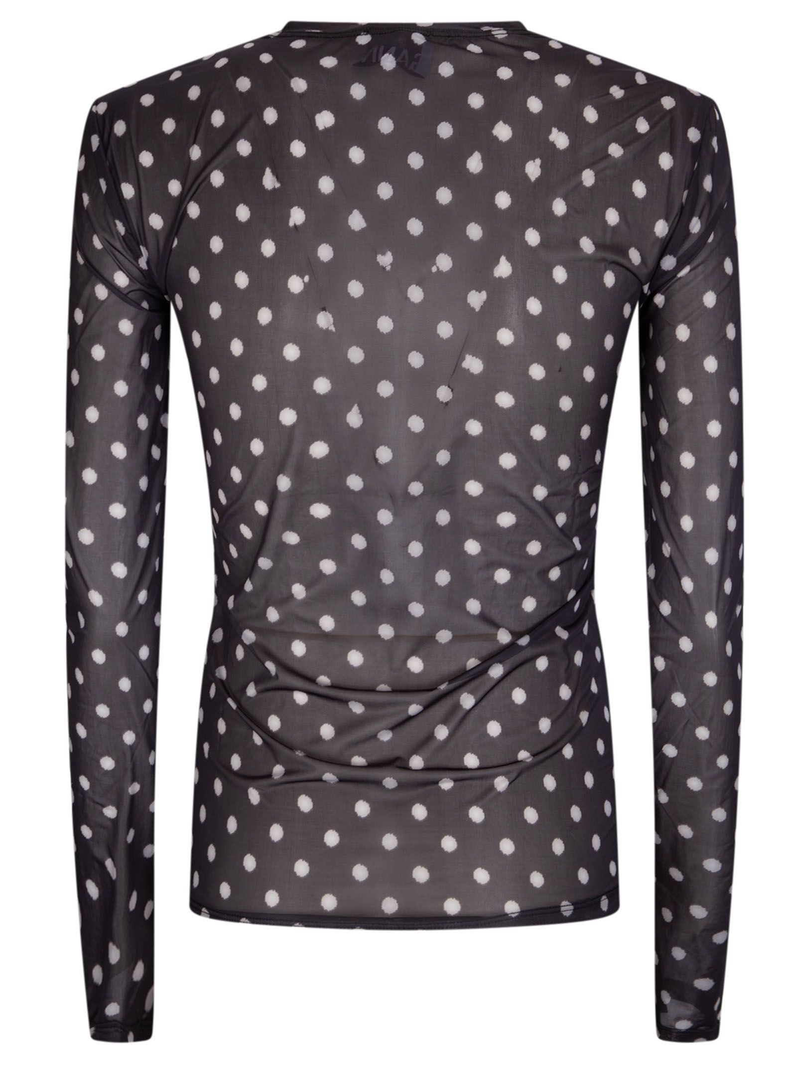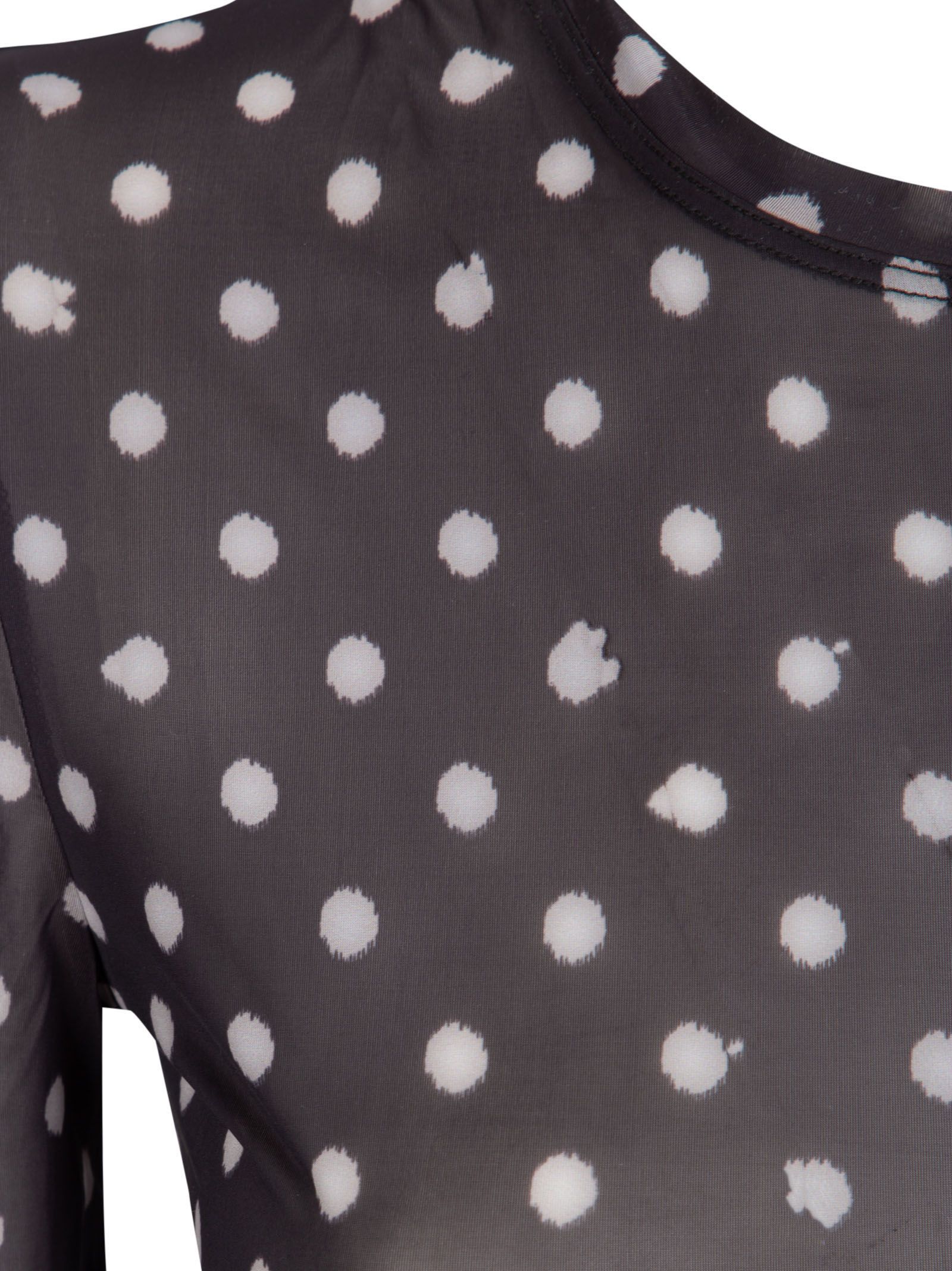Top nero, motivo a pois, girocollo, maniche lunghe, vestibilità aderente.