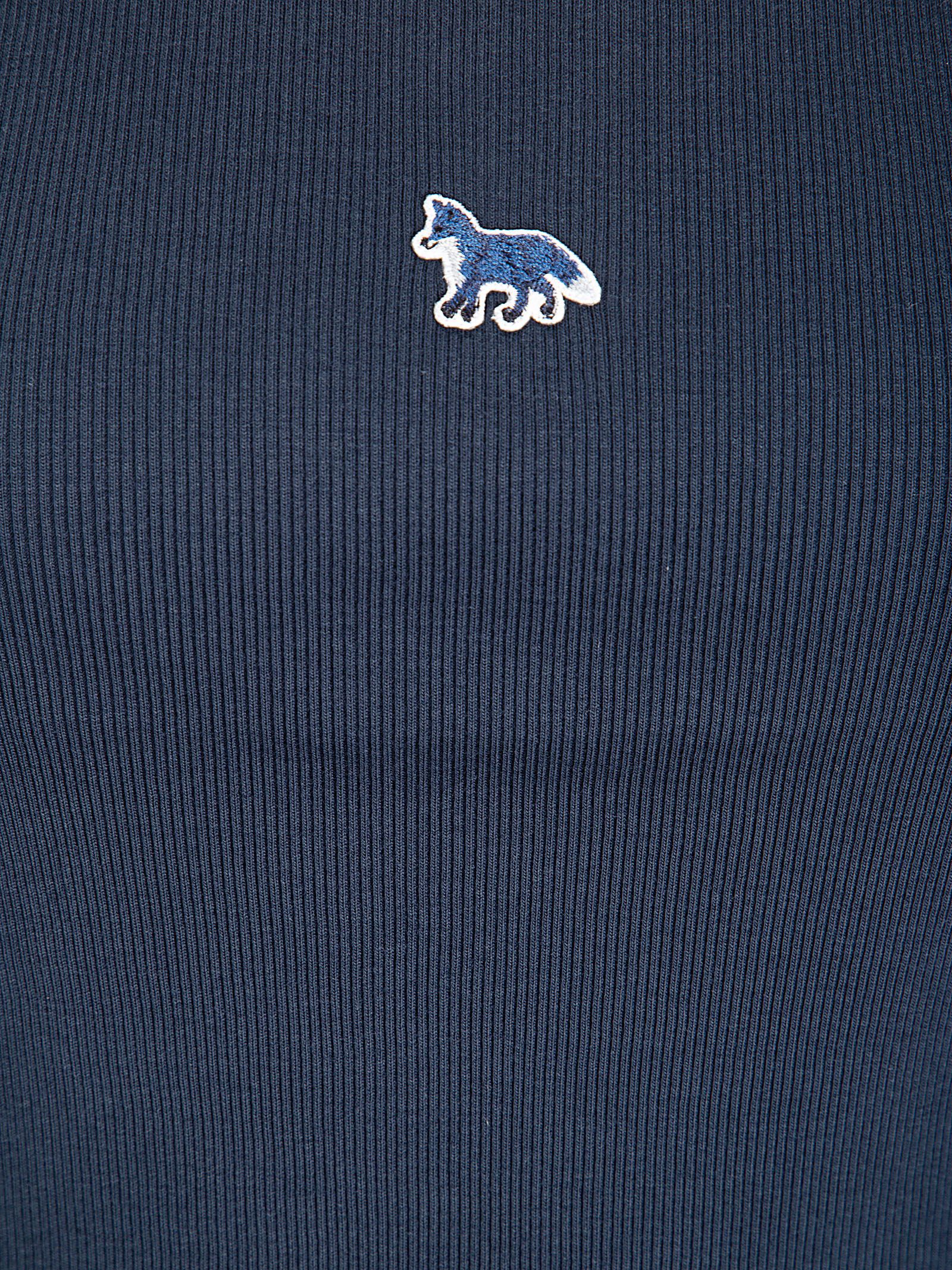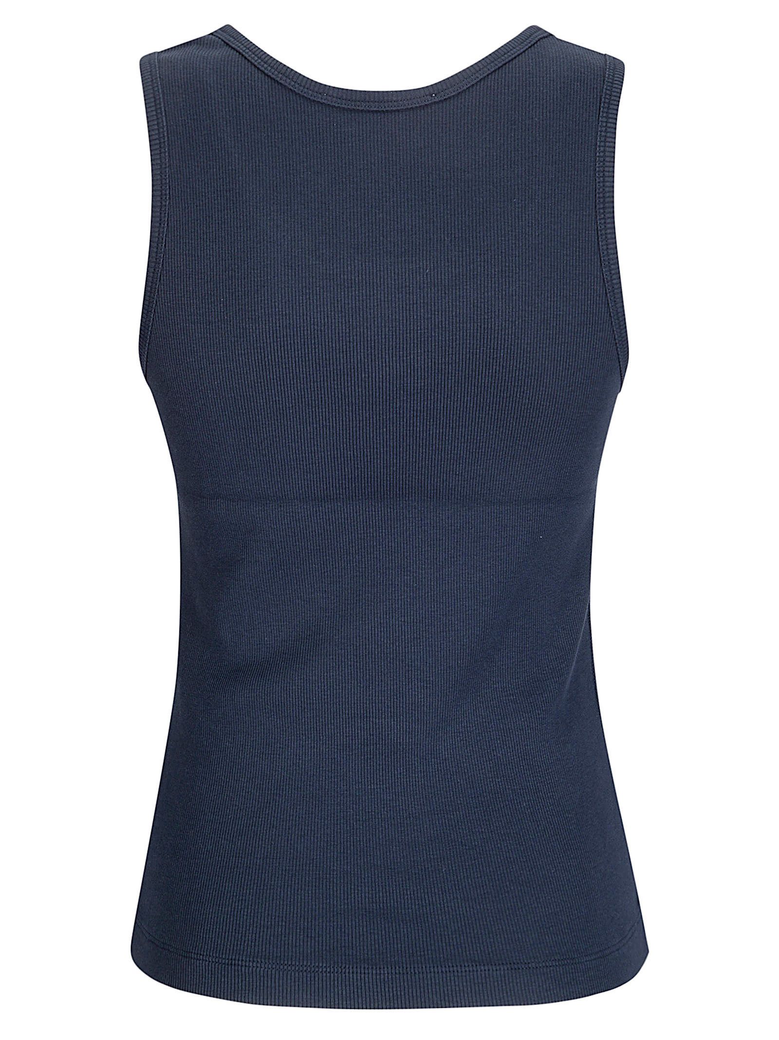 Top girocollo ampio, senza maniche, logo applicato frontale, slim fit.