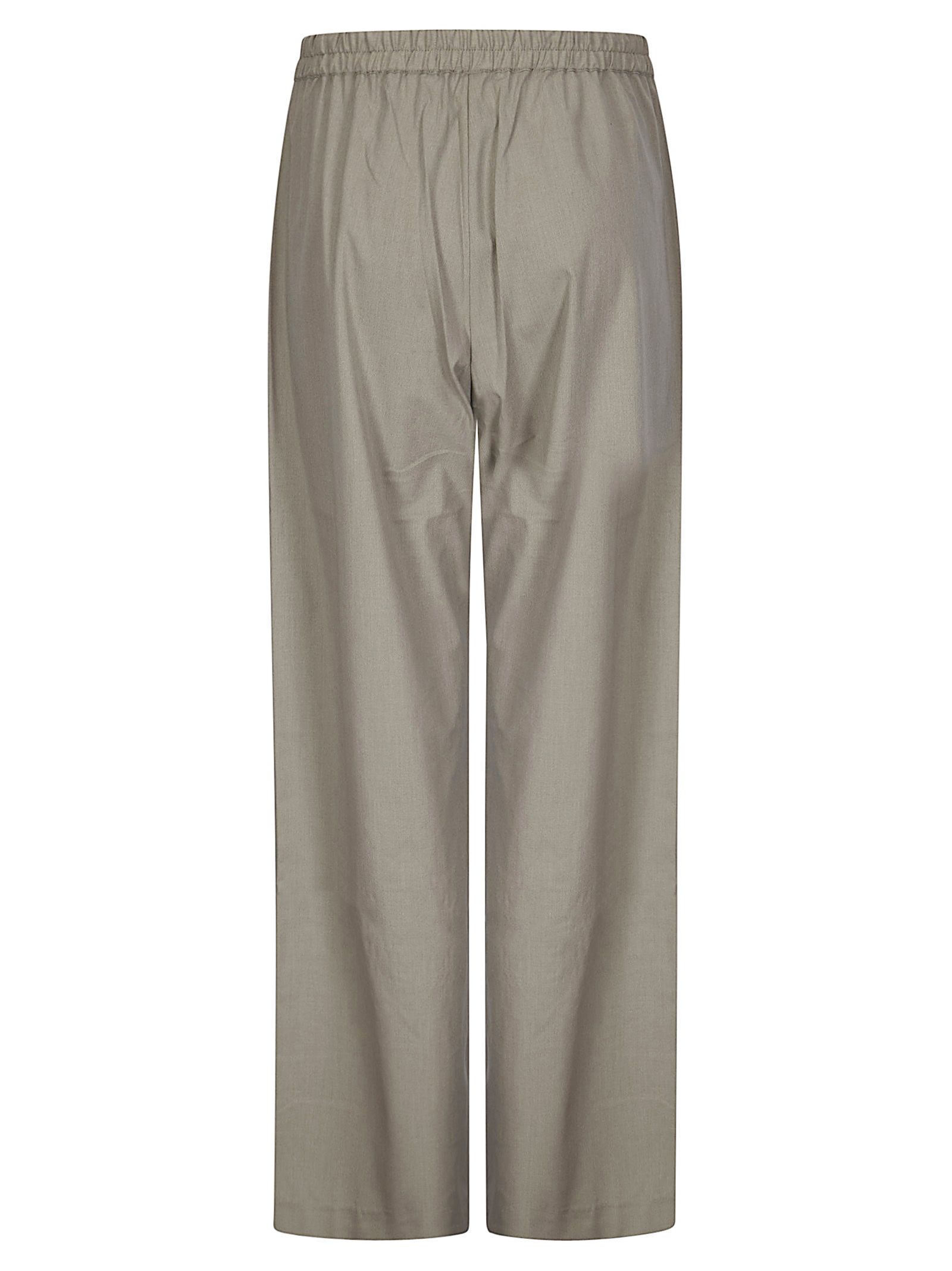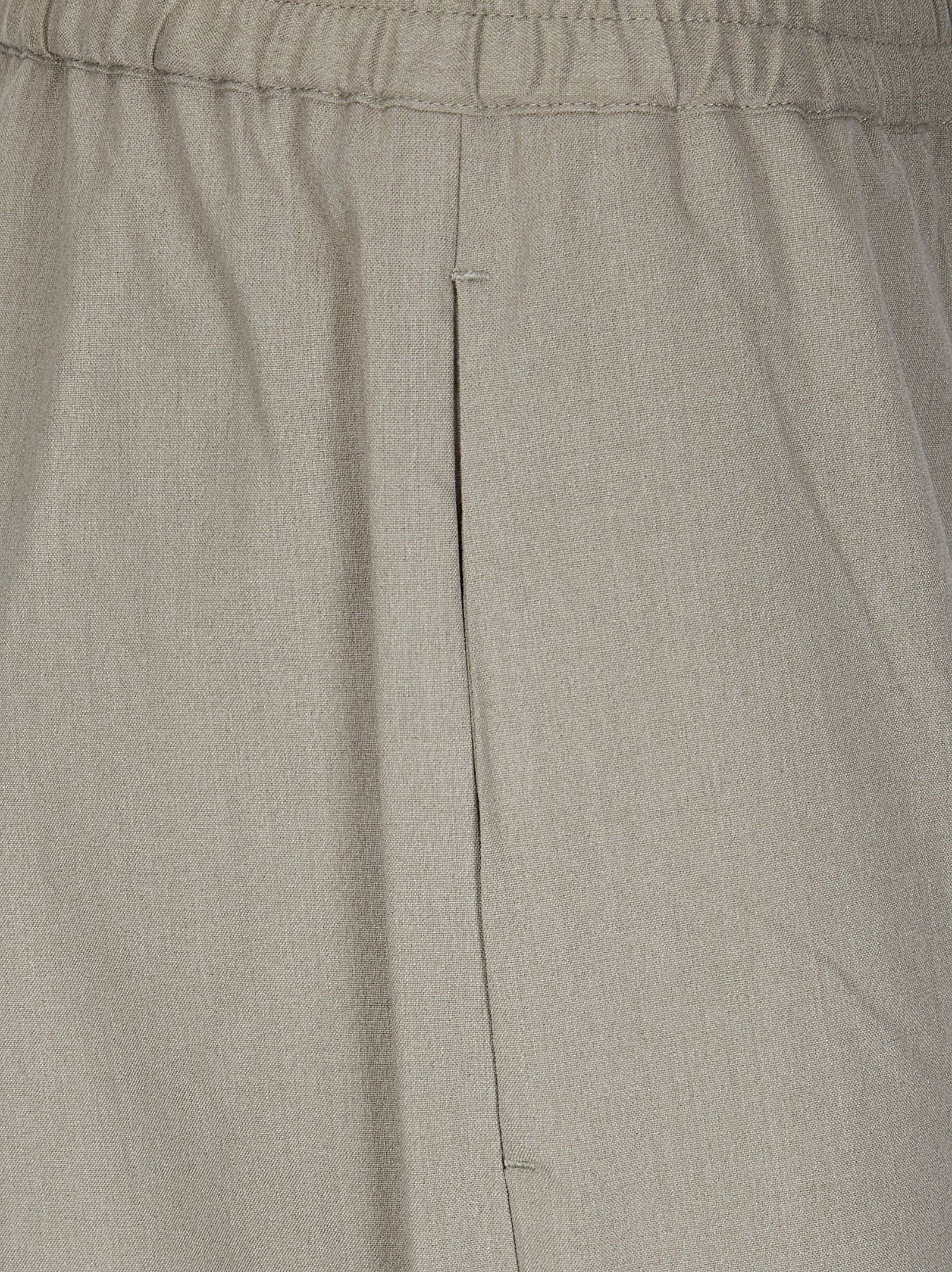 Pantaloni gamba ampia con vita elasticizzata e chiusura con bottone e zip, due tasche a filetto, vestibilità morbida