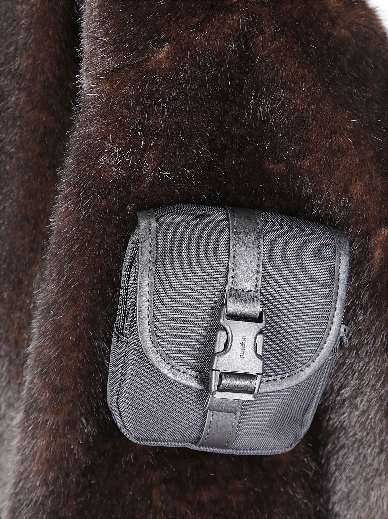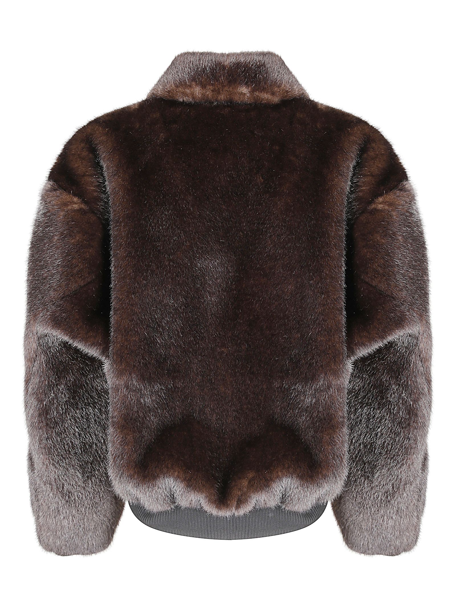Blouson bomber en fausse fourrure, col montant, fermeture zippée, pochette logo sur la manche.