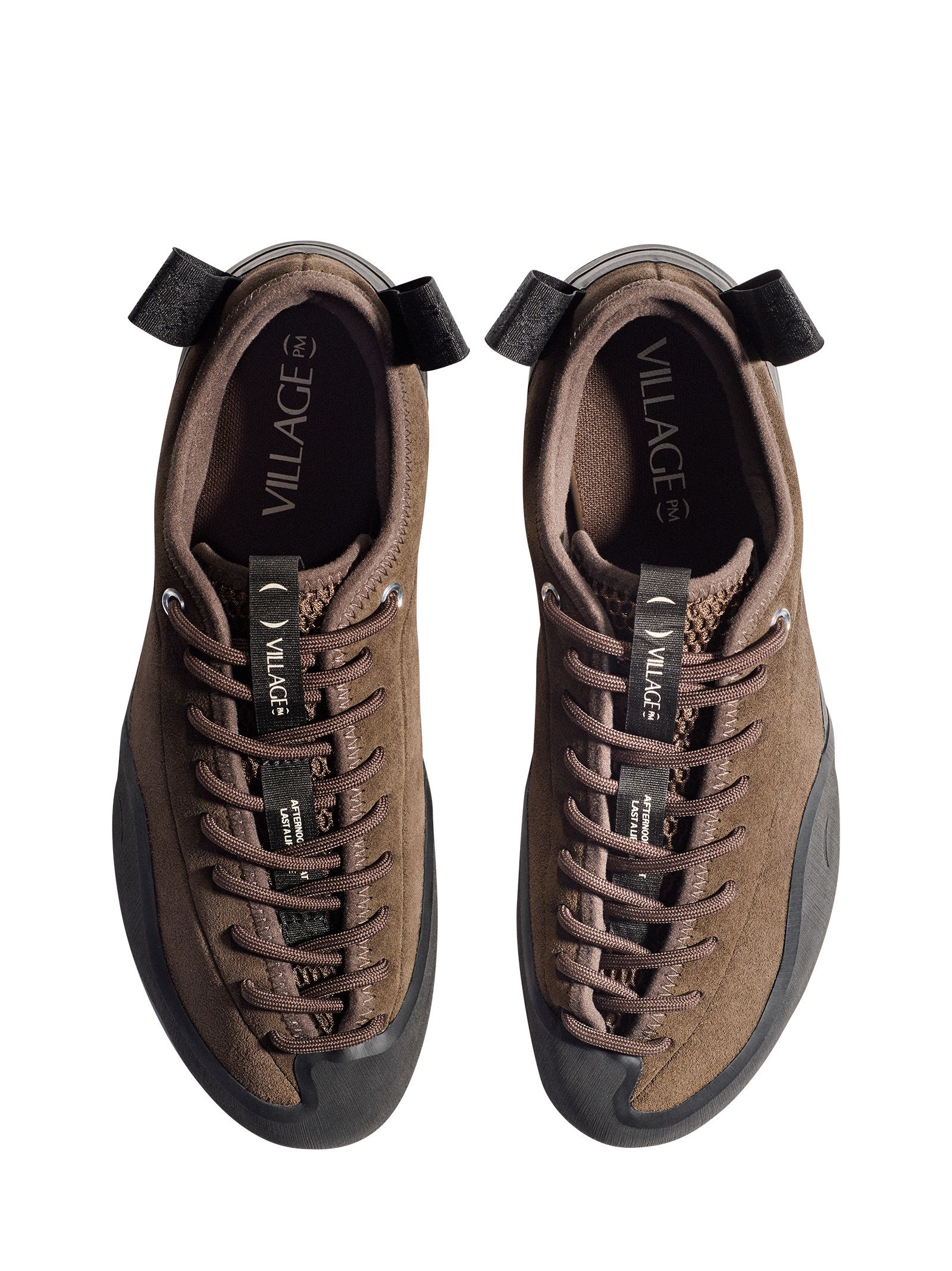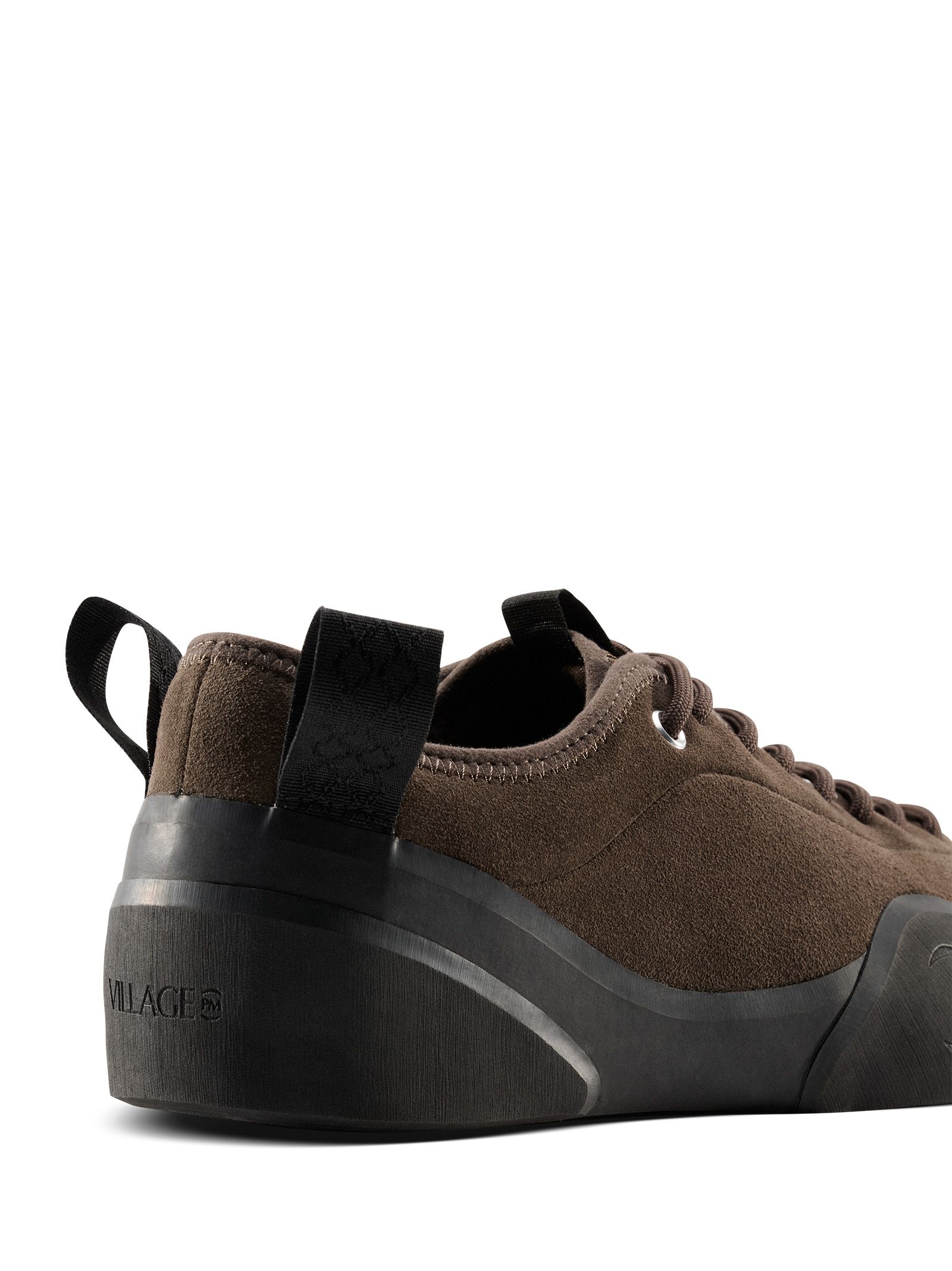 Baskets basses modèle 1PM, marron foncé avec semelle en caoutchouc contrastante, design style chaussure de skate, lacets d'escalade, double languette arrière.