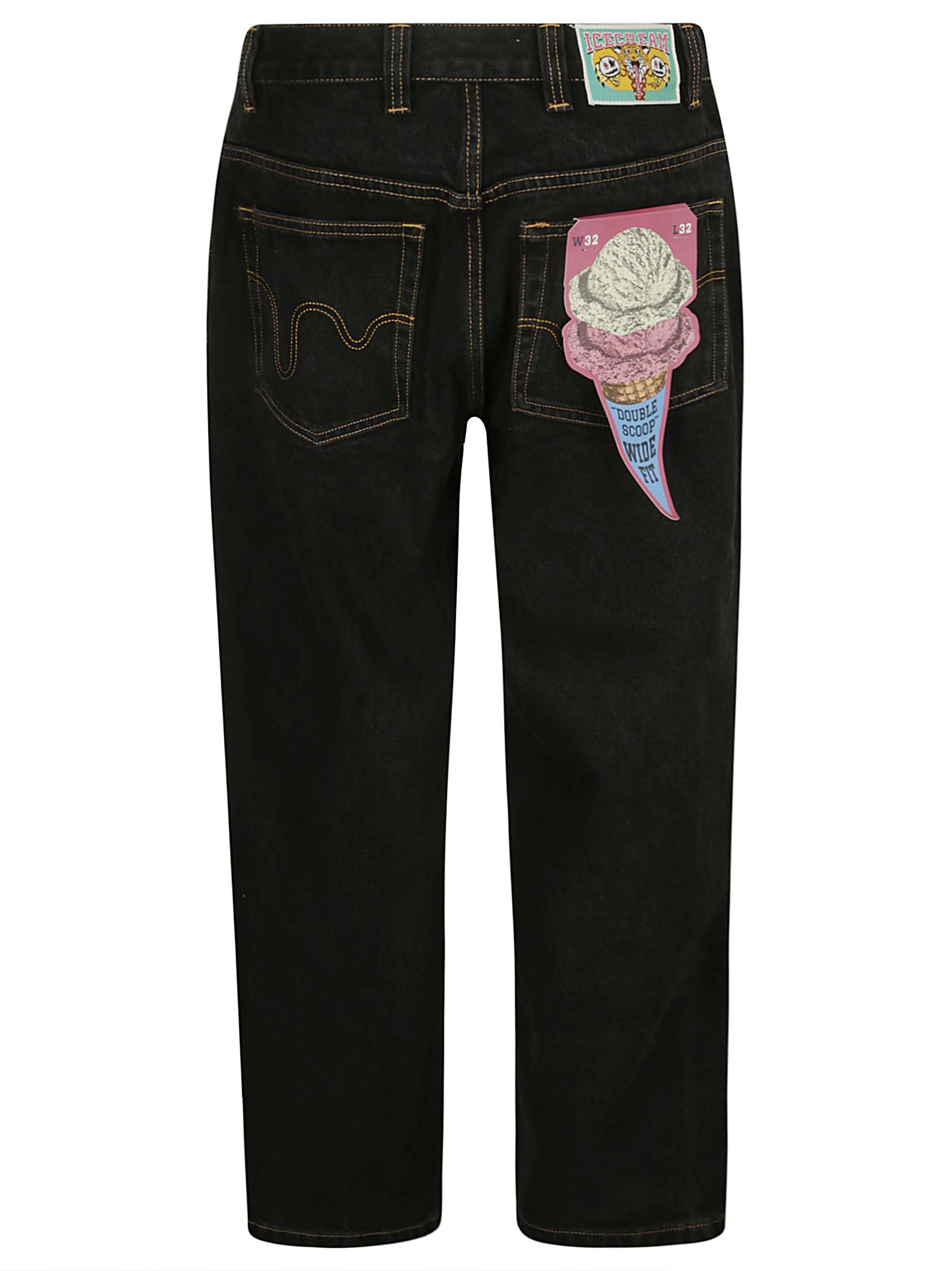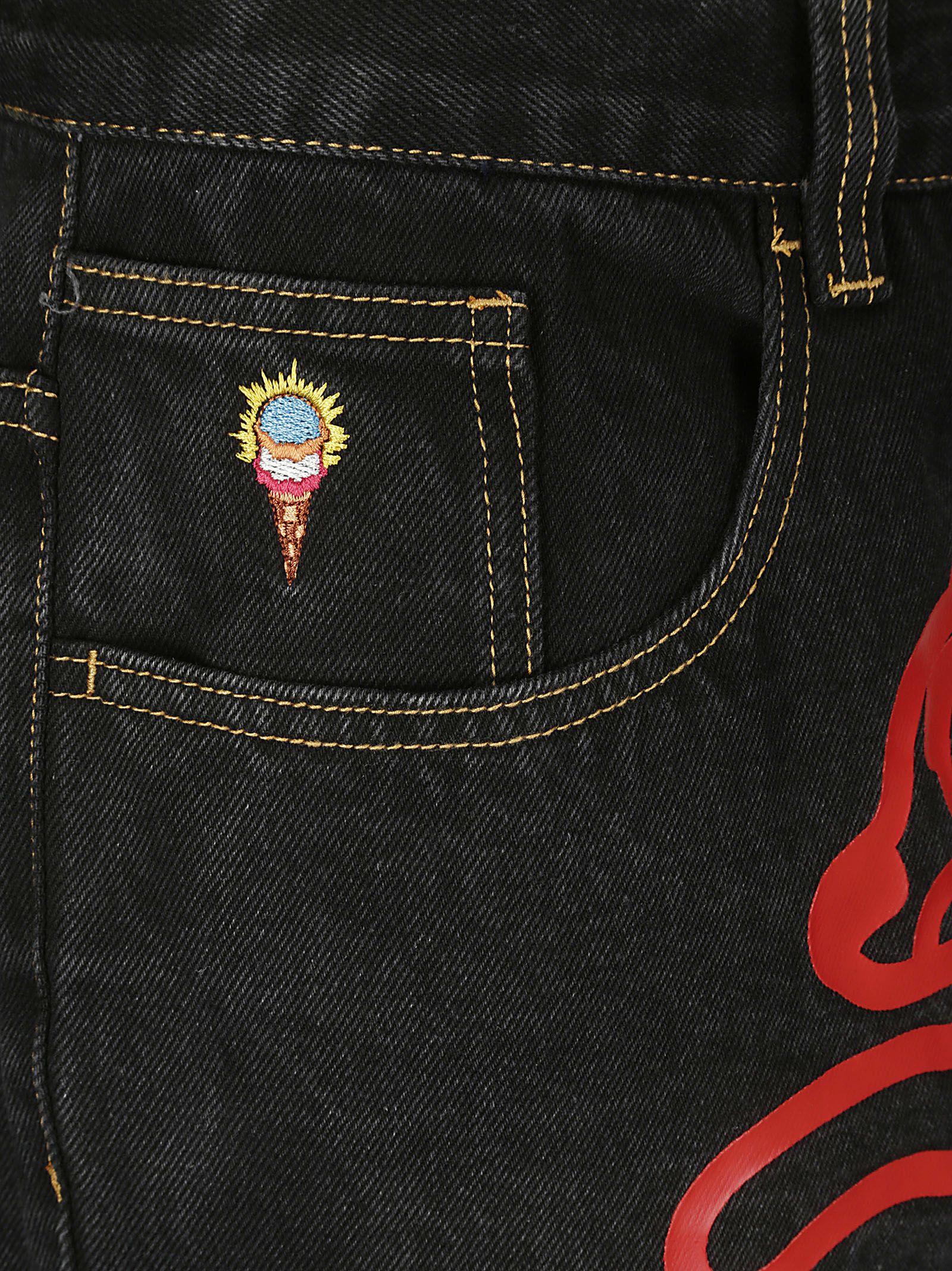 Jean avec imprimé rouge sur le devant, coupe classique et jambe large, noir délavé, rabat coloré au dos.