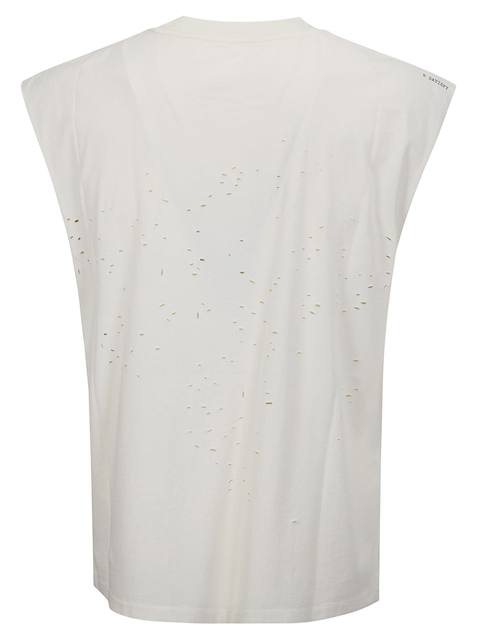 Tshirt smanicata, fit comodo, design effetto rovinato, logo frontale, cotone organico, cooling.