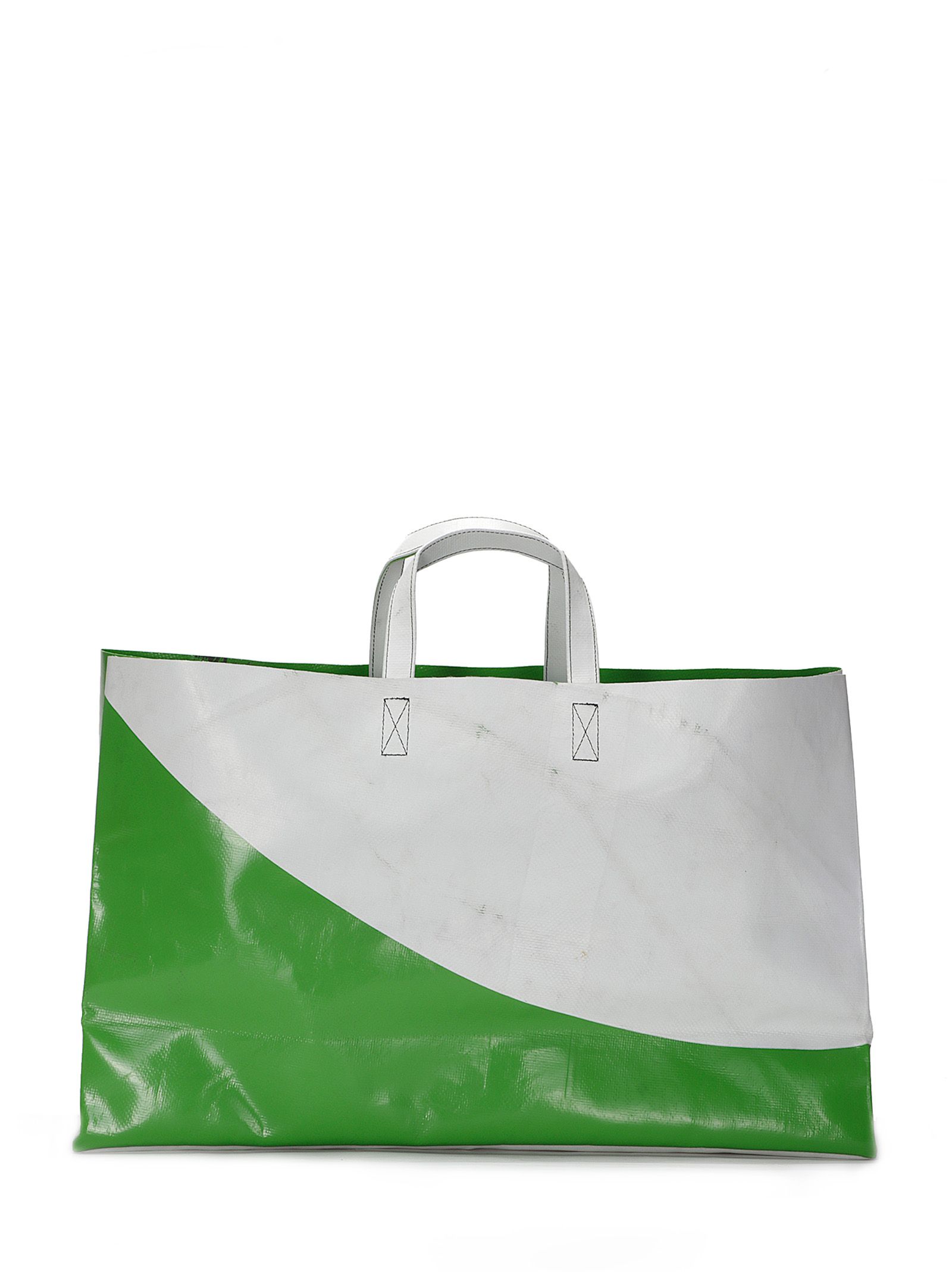 Sac shopping avec deux anses, sans fermeture, grand espace pour les articles longs, pliable.