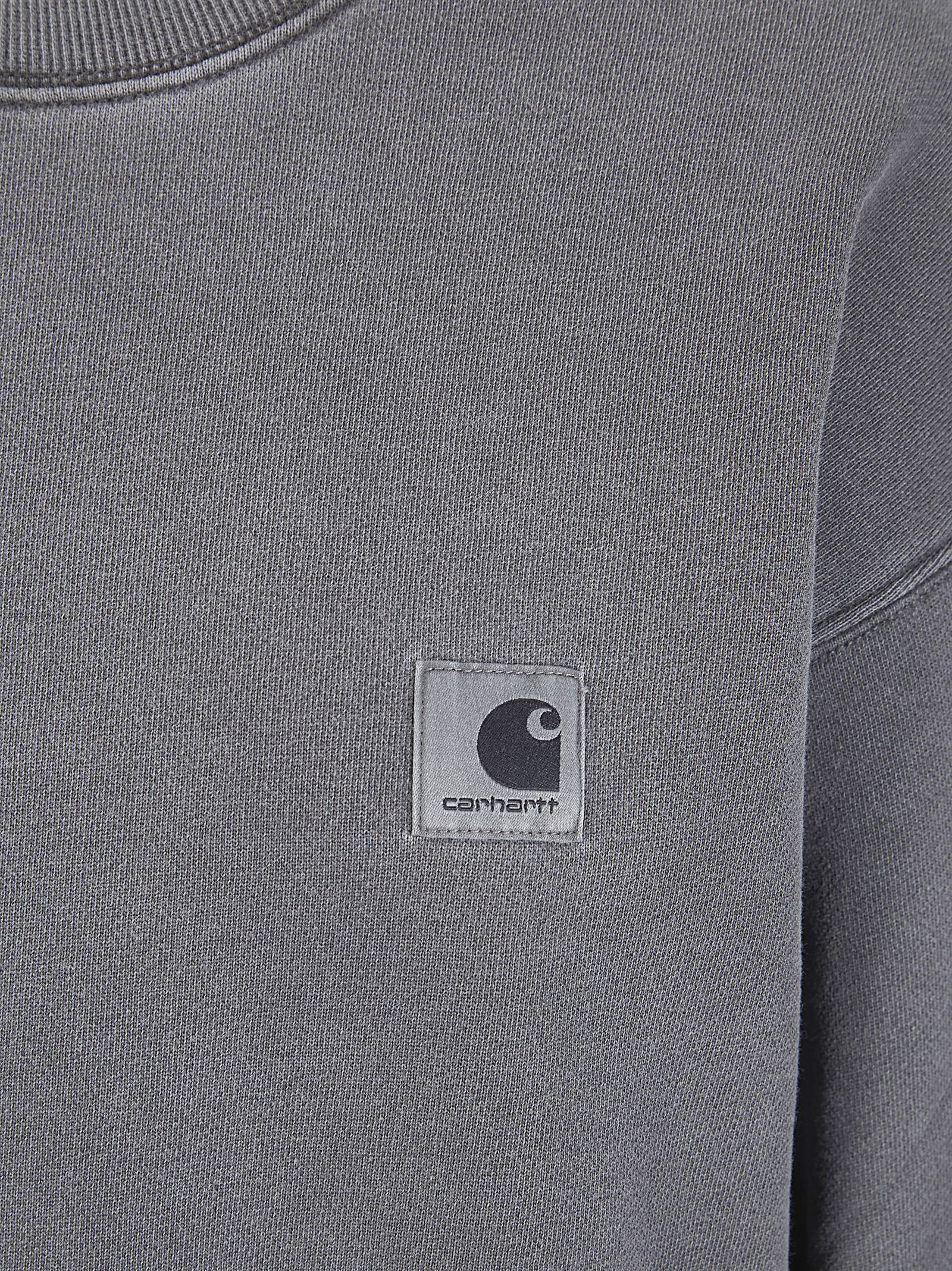 Felpa in cotone leggero, colletto tondo, patta con logo frontale, lavaggio medio.