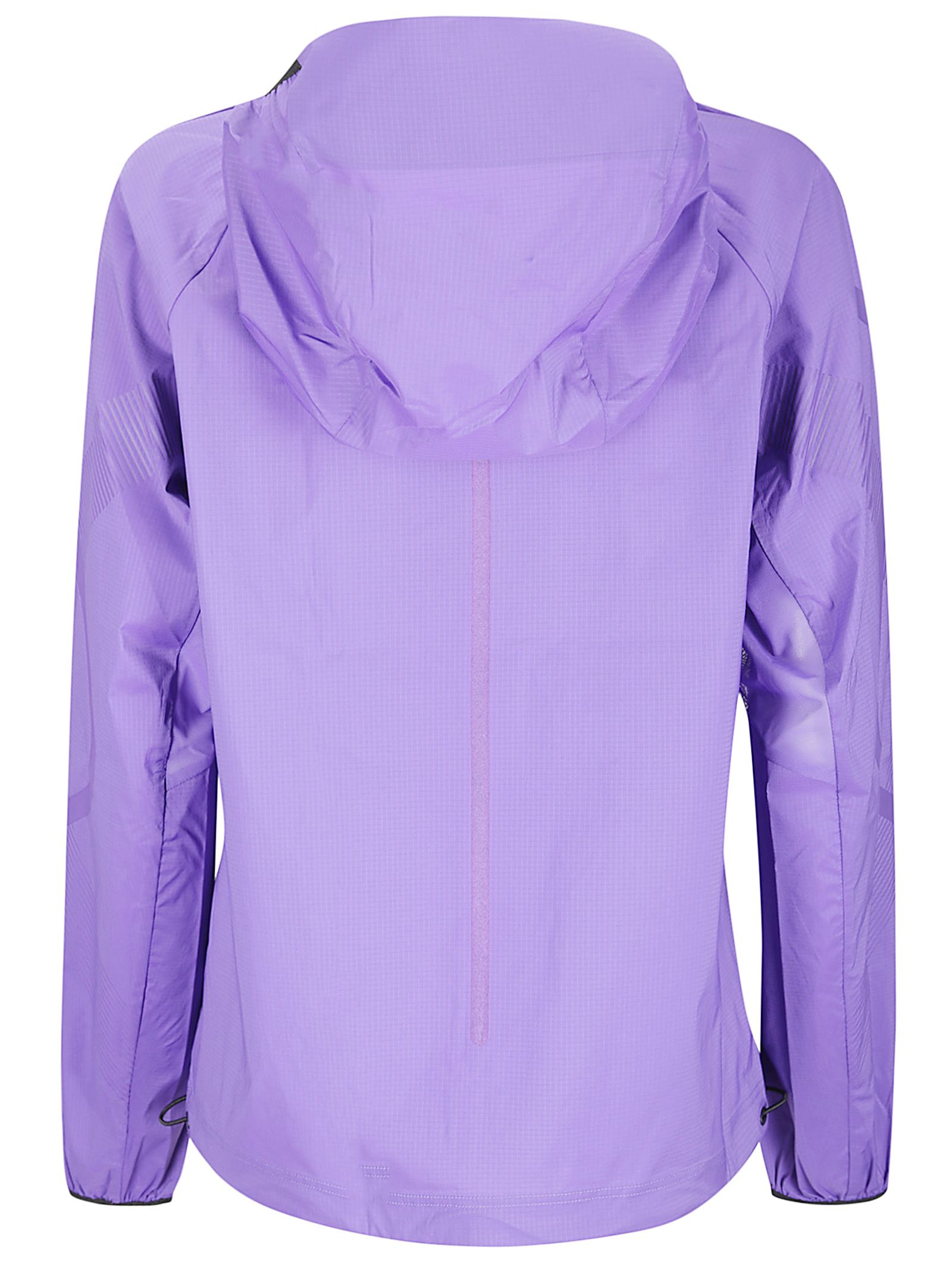 Giacca antivento in tessuto leggero, chiusura con zip a contrasto, cappuccio, tasca frontale, coulisse laterale.