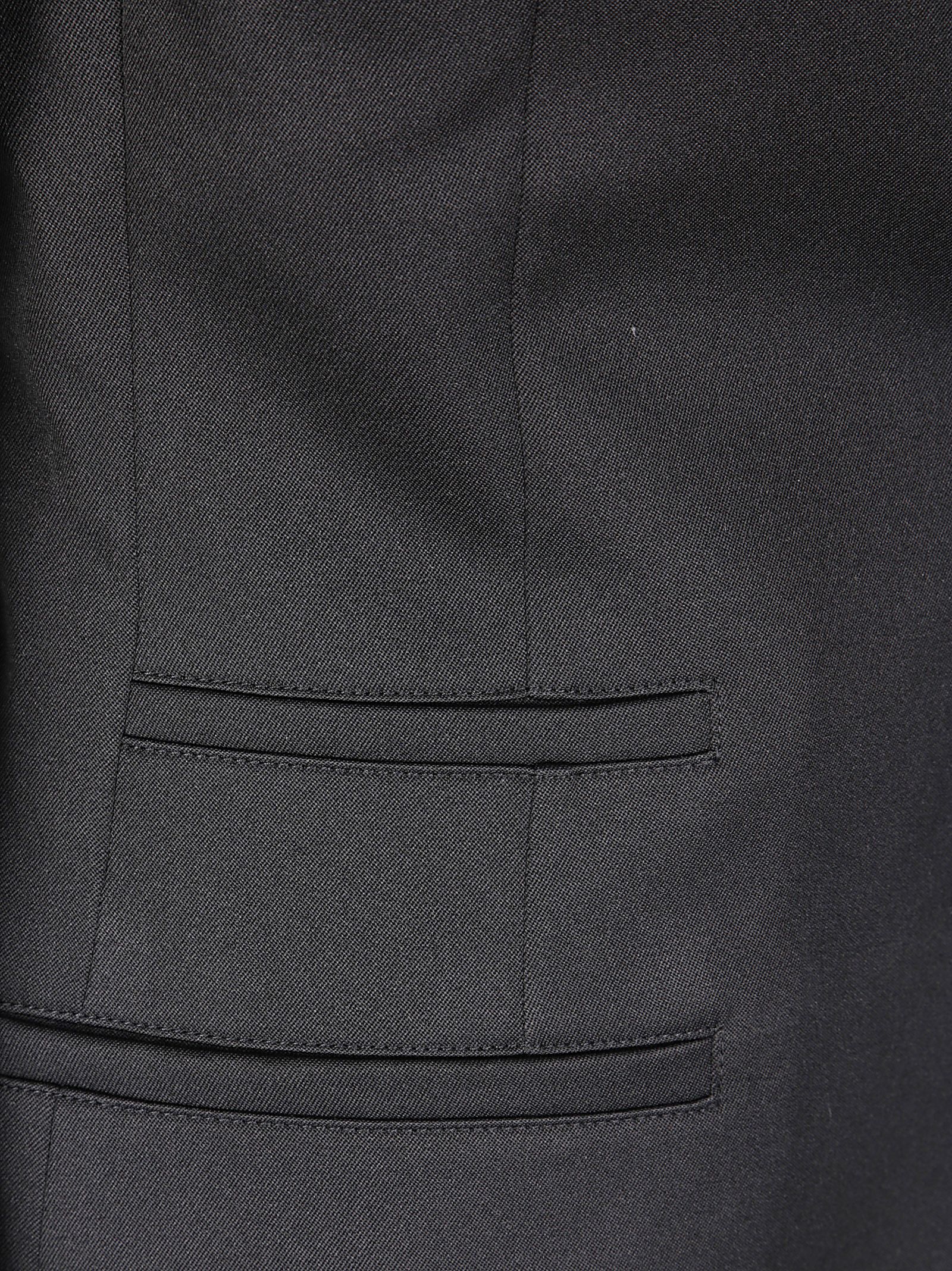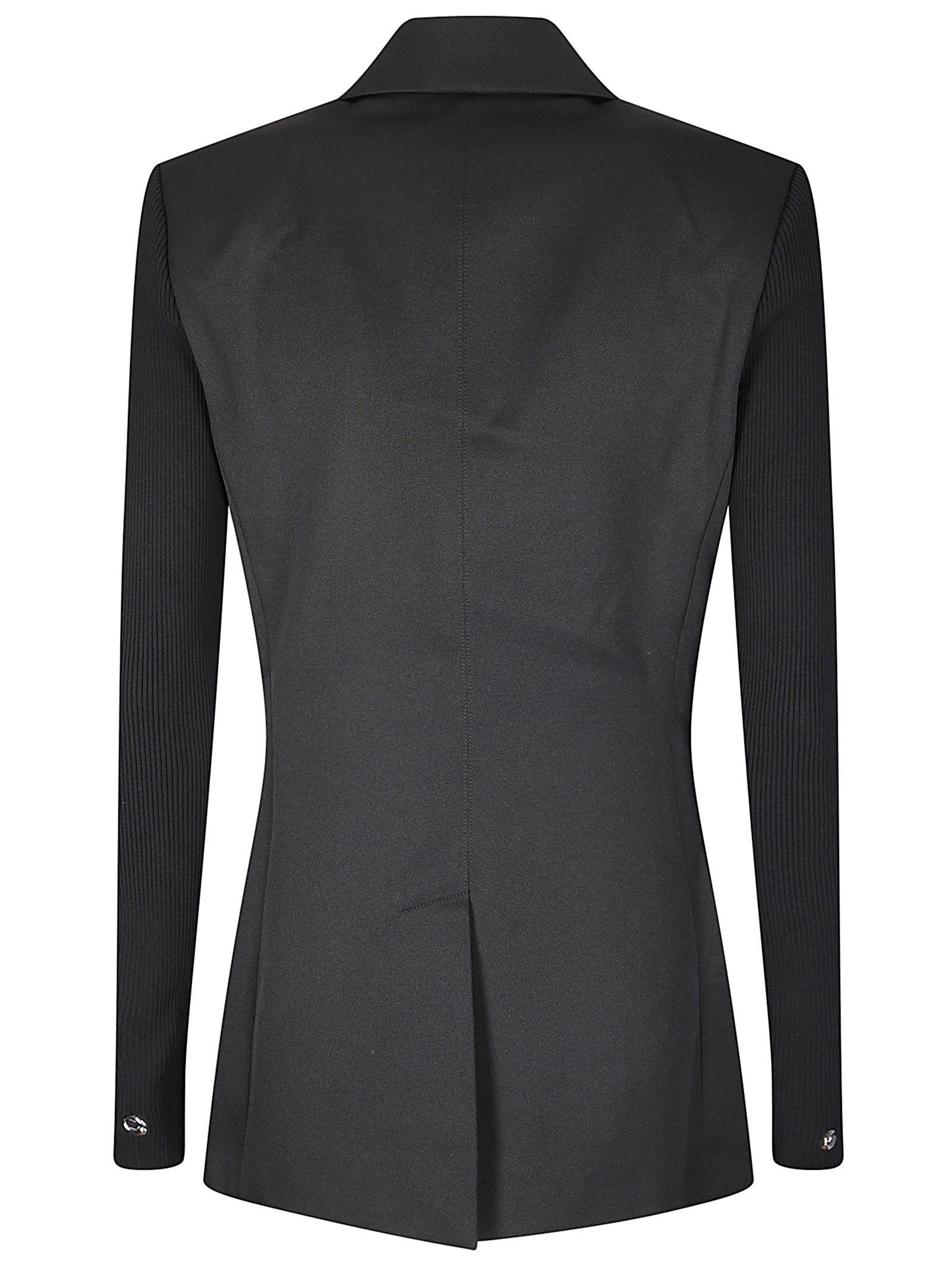 Giacca monopetto, colletto a revers, maniche in maglia nera a coste, allacciatura con bottoni, tasche a filetto sul davanti.
