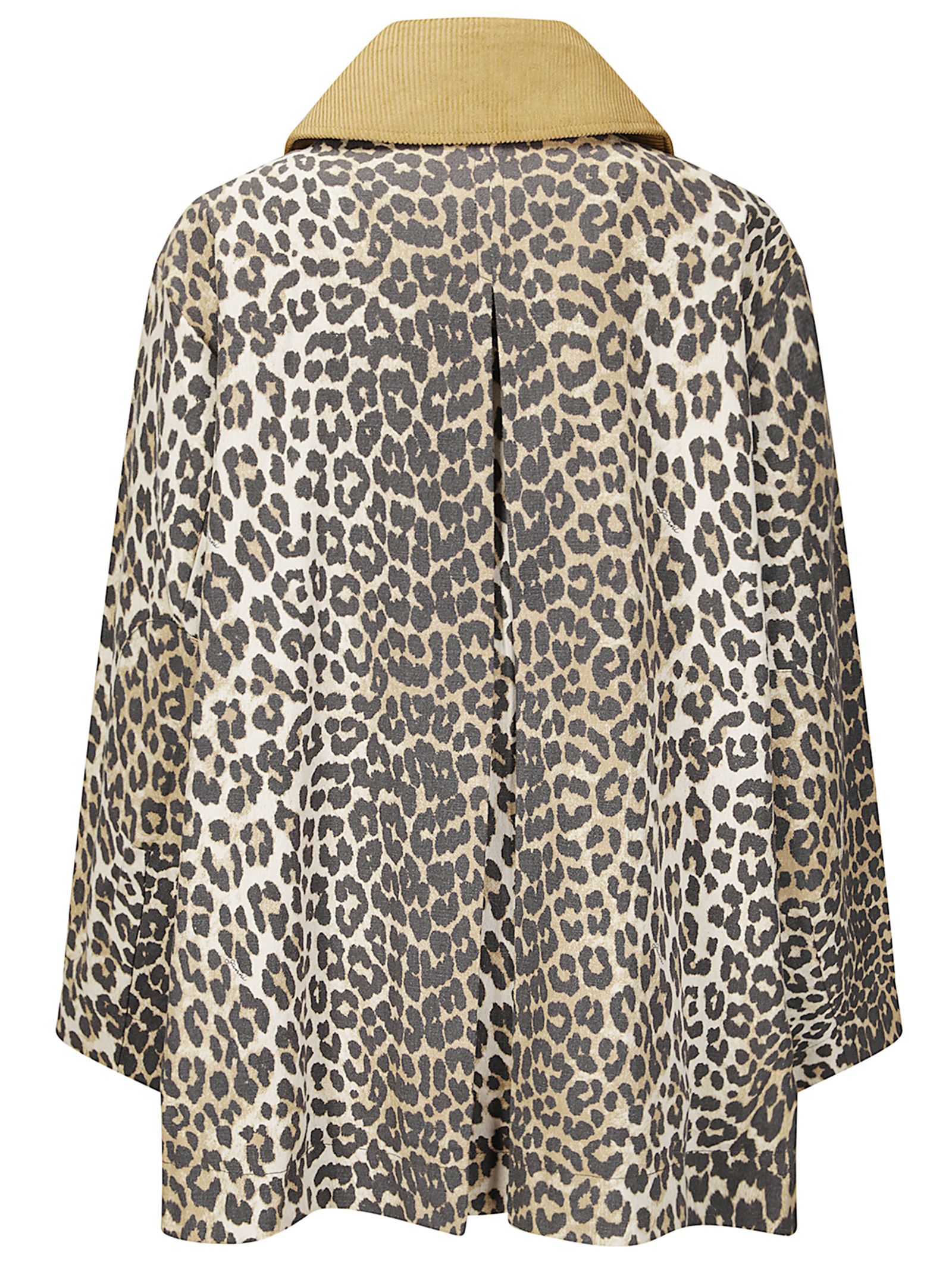 Giacca in canvas con stampa animalier, colletto in velluto a coste, chiusura con bottoni frontale, tasche oversize e maniche dal taglio dritto.