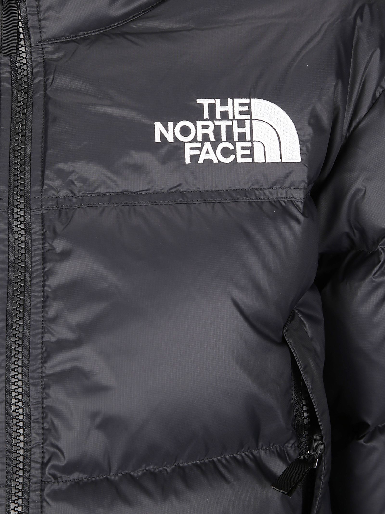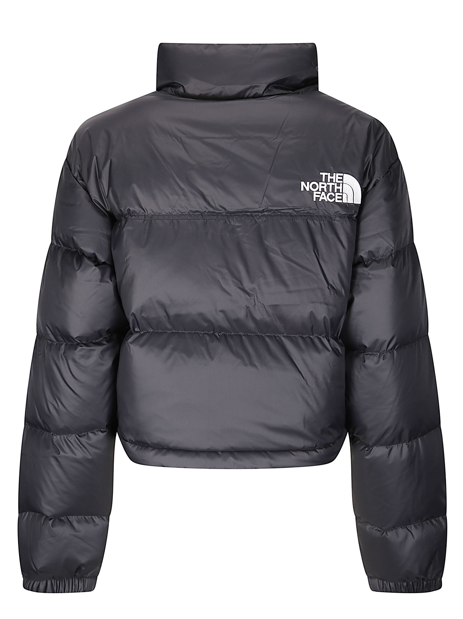 Giacca piumino nero corto con logo ricamato frontalmente e posteriormente, chiusura con zip, tasche laterali, colletto alto.