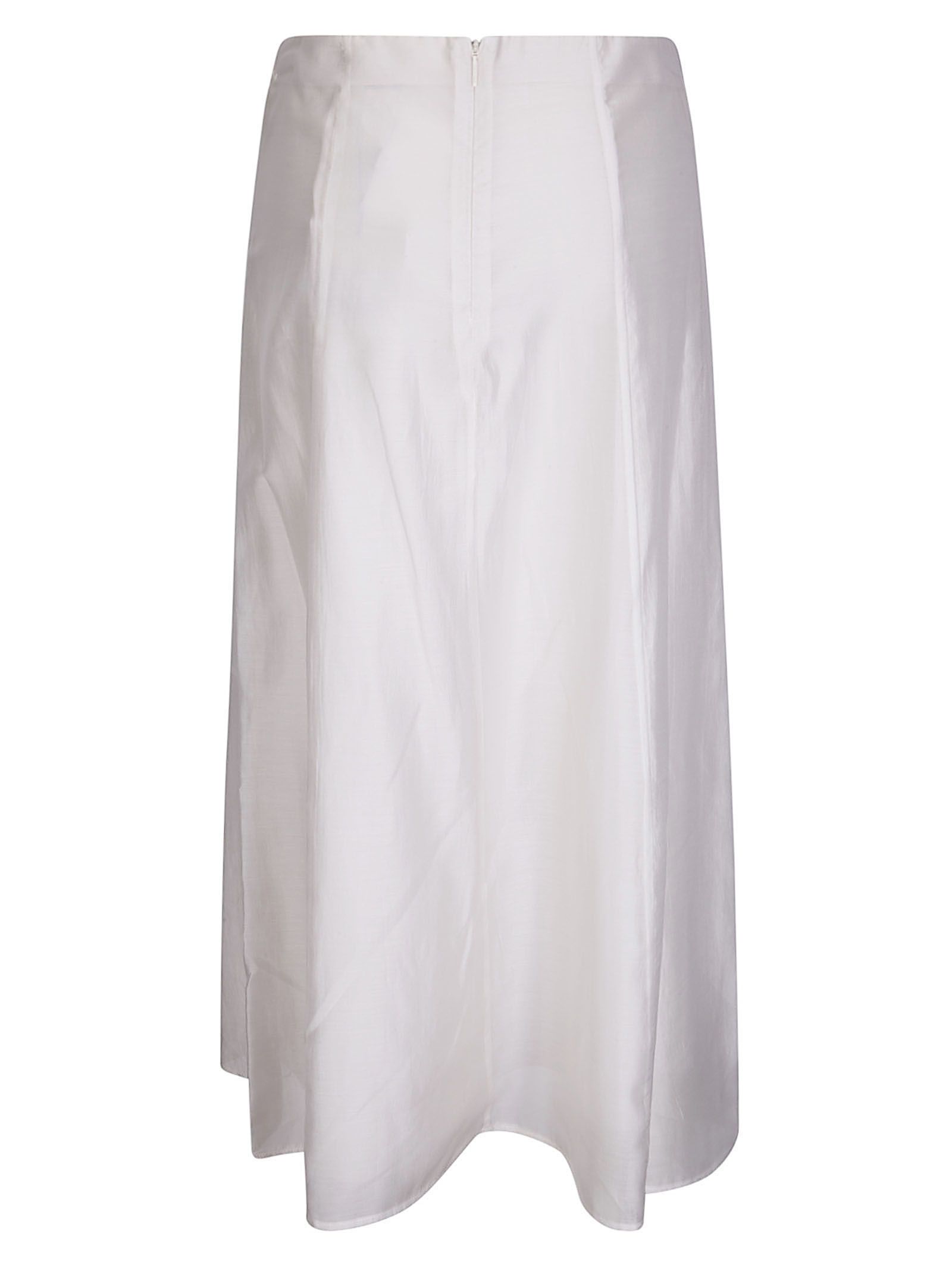 Gonna lunga svasata, chiusura con zip posteriore, tessuto foderato.