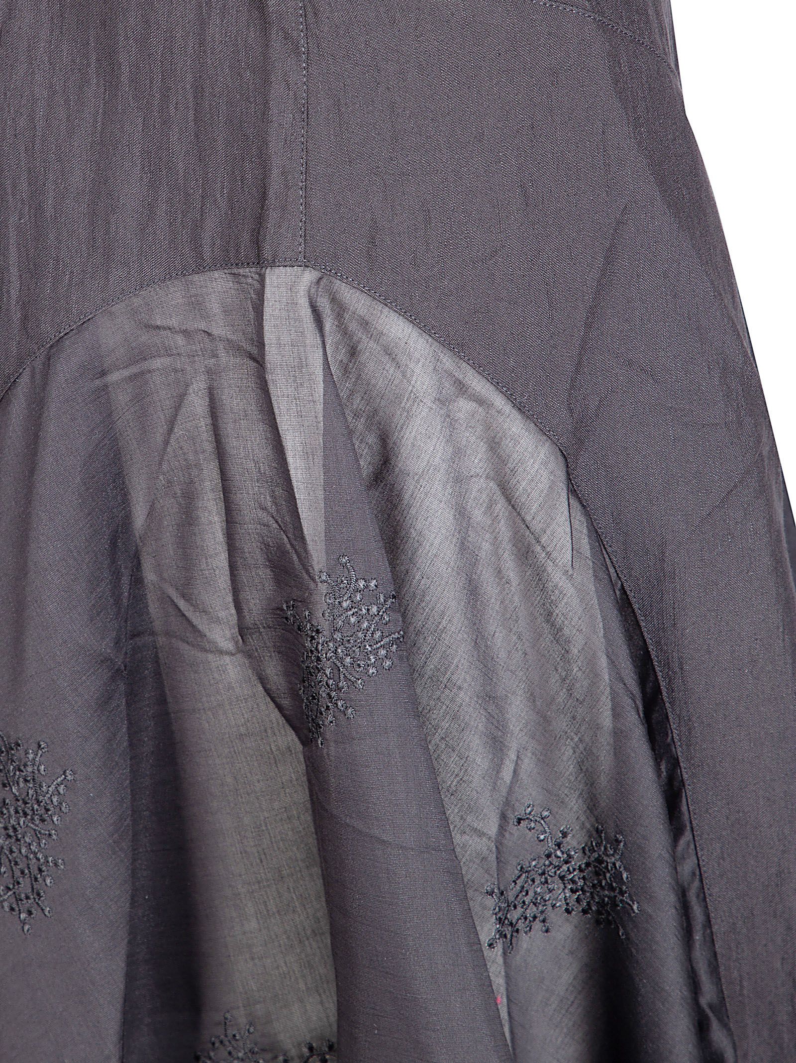 Gonna svasata con orlo asimmetrico, tessuto leggero semitrasparente, chiusura posteriore con zip.