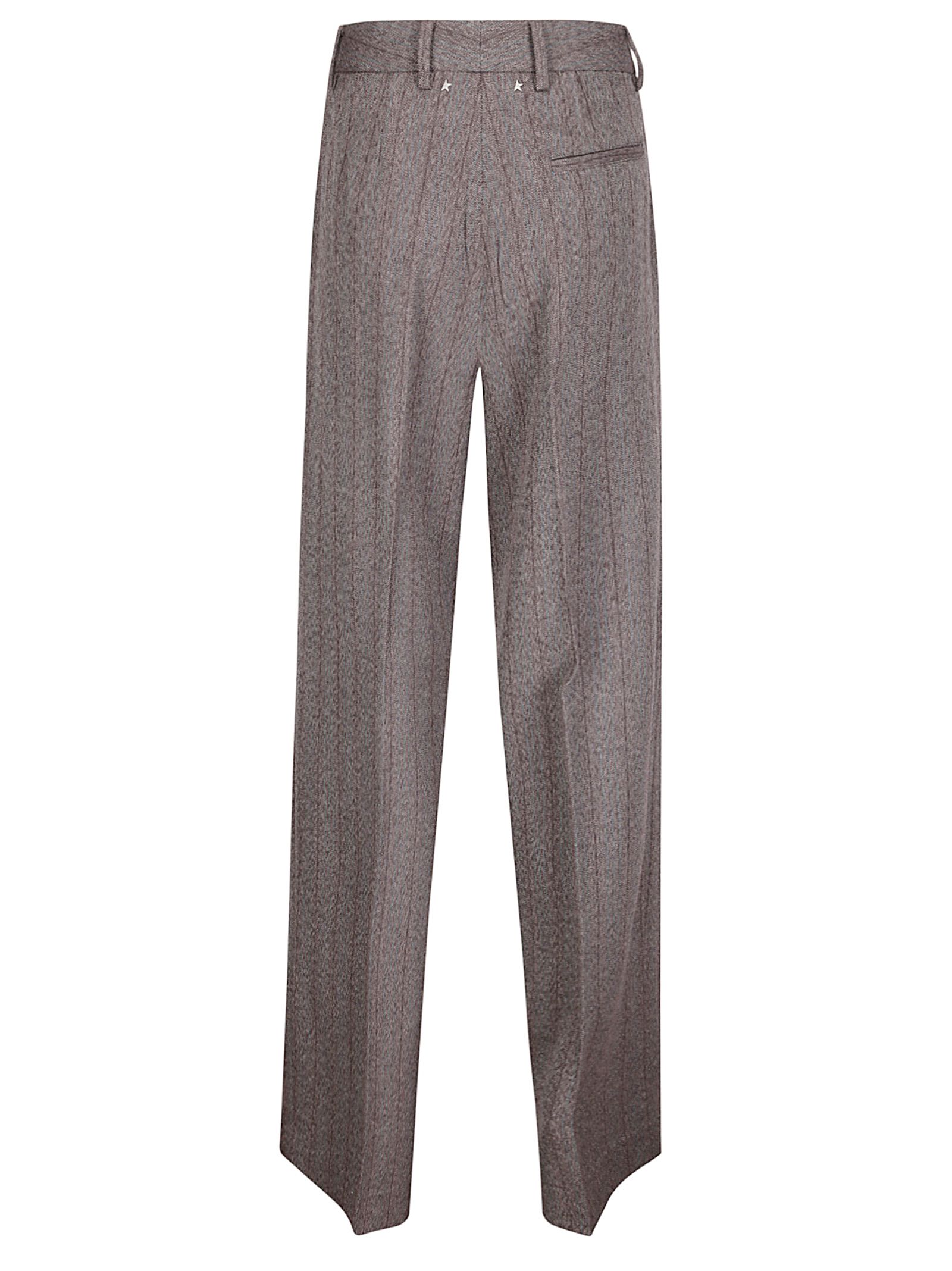 Pantaloni con pinces a gamba larga, chiusura con zip e gancio metallico,tasche anteriori con patta e bottone, fantasia gessata.