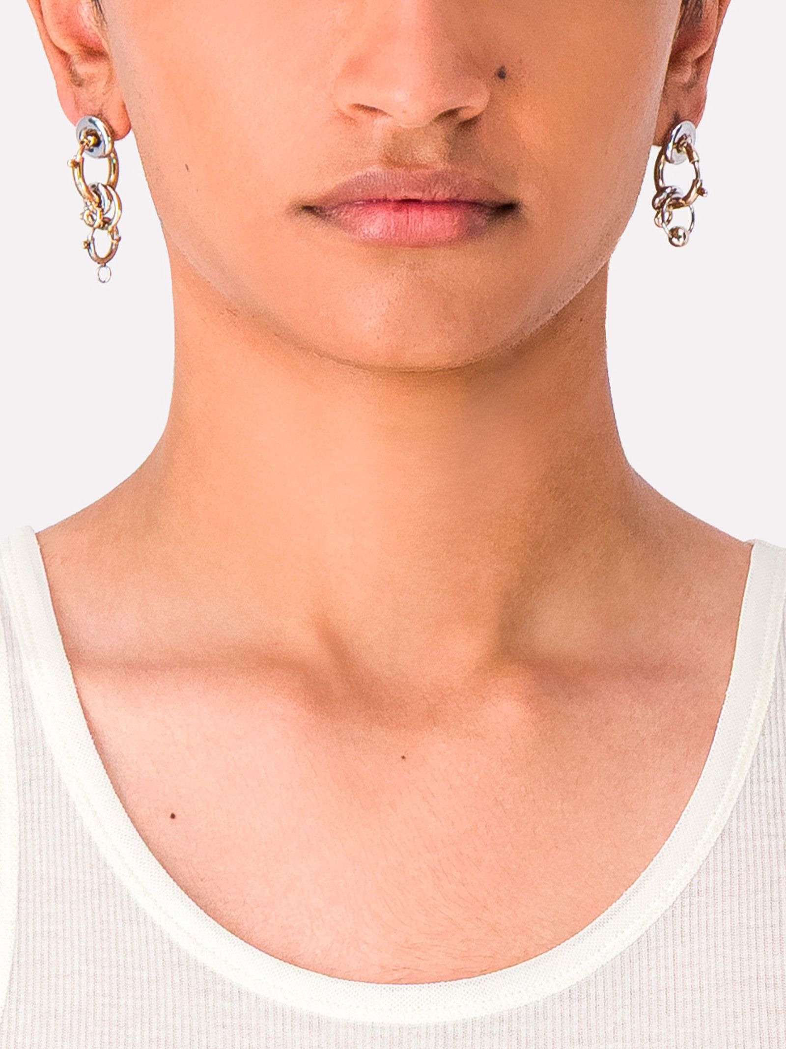Coppia di orecchini asimmetrici argento e oro, chiusura con farfallina, con cerchi.