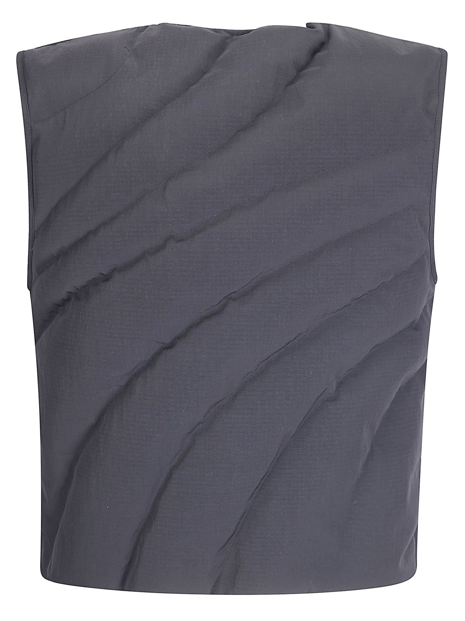 Gilet trapuntato con zip a doppio cursore, patta con chiusura a due bottoni, orlo con coulisse regolabile e due tasche laterali con cerniera.