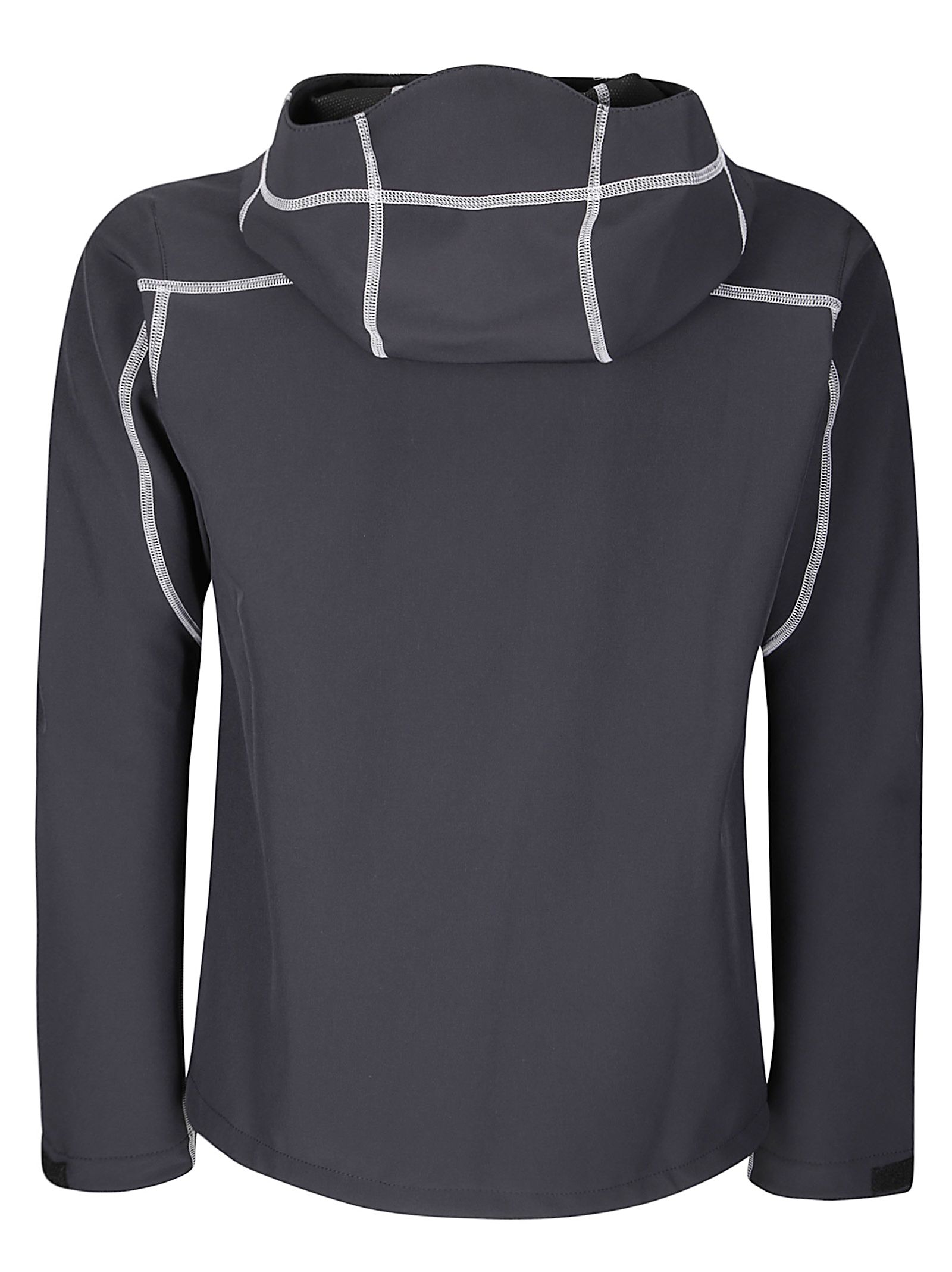 Giacca in materiale tecnico adatta a climi rigidi, chiusura con zip, cappuccio, ricami a contrasto.