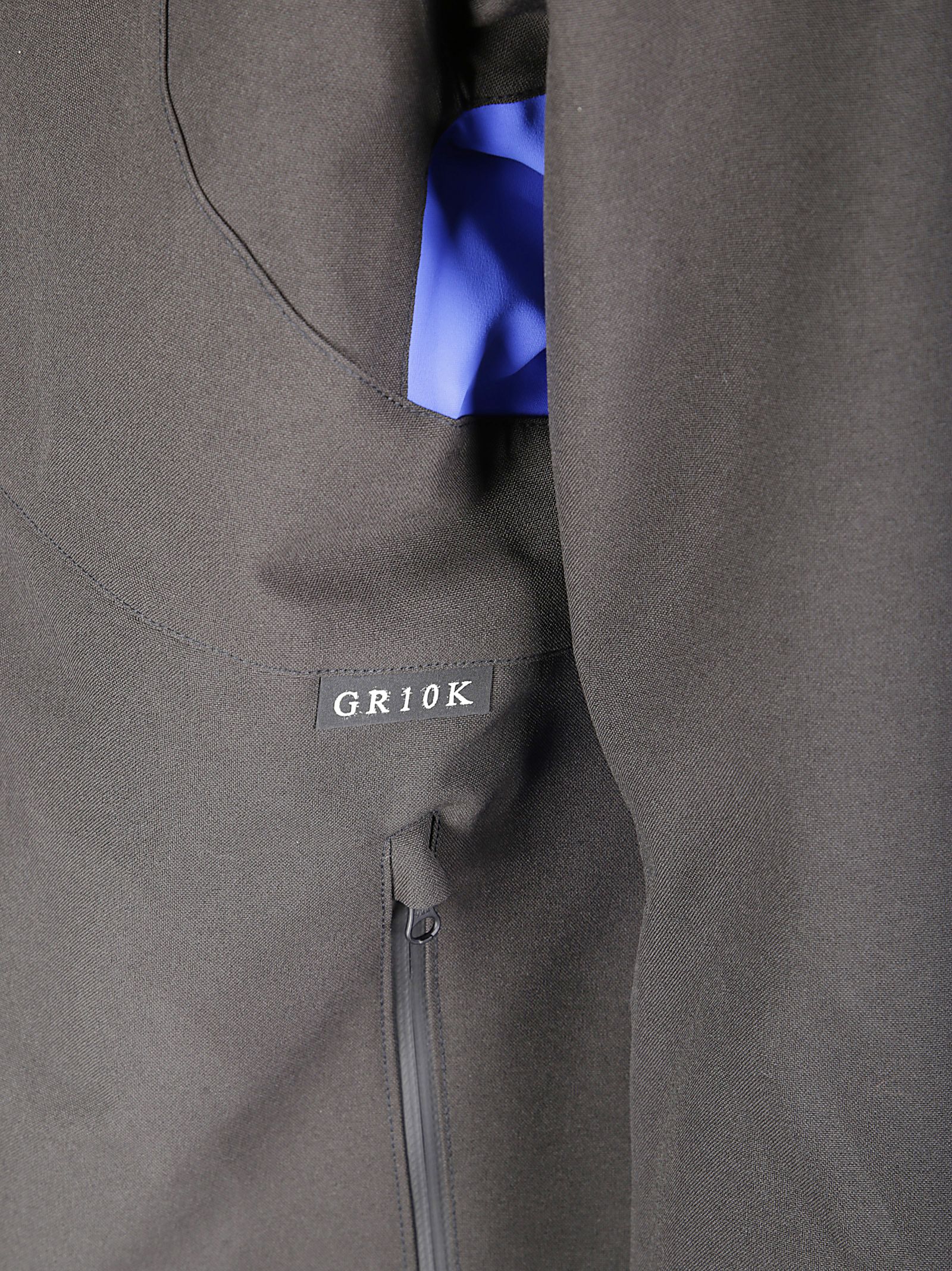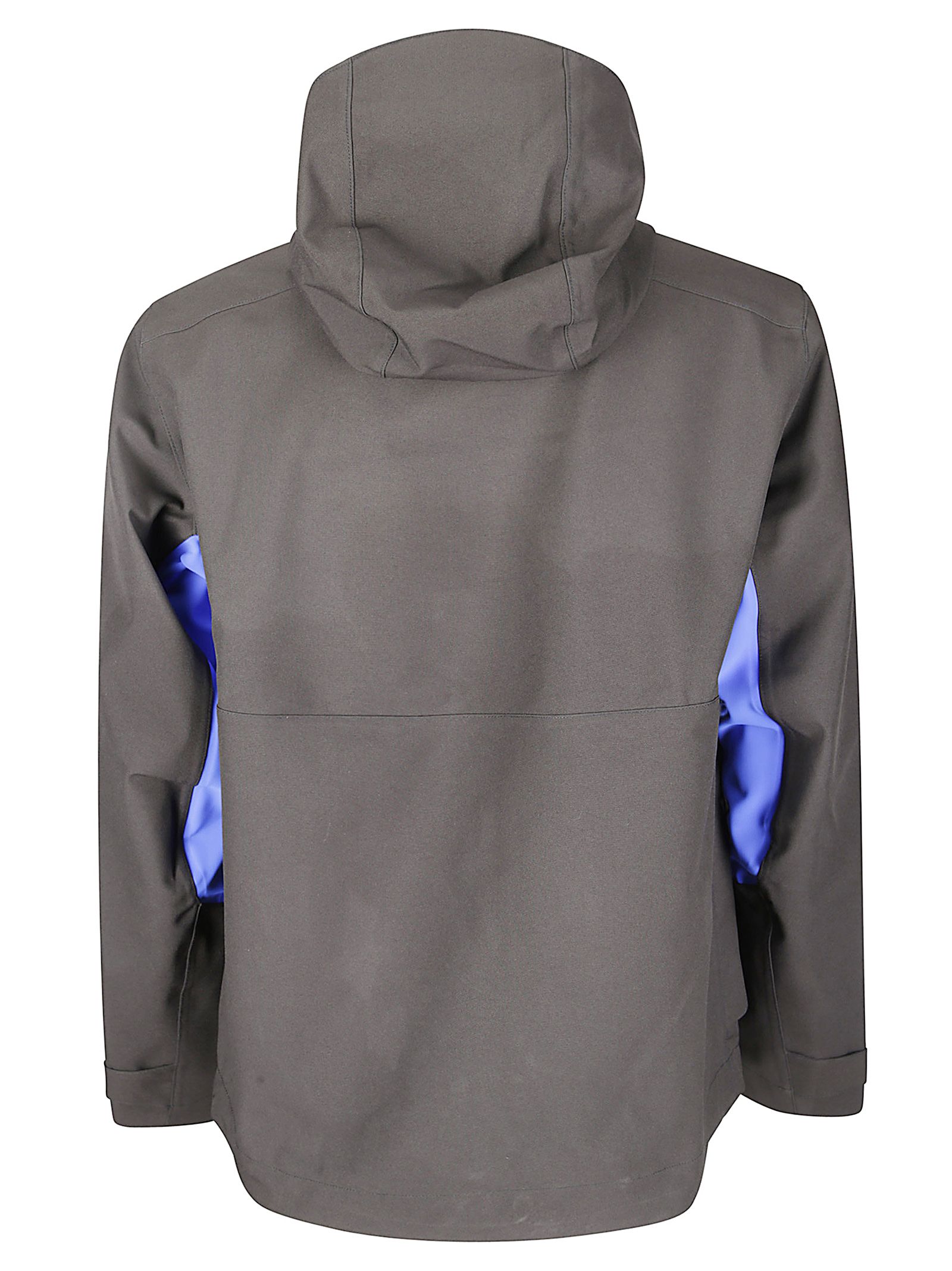 Giacca in tessuto impermeabile con tessuto elastico a contrasto sul cappuccio e sotto la manica, chiusura con zip bidirezionale, due tasche con zip sul petto e in vita.