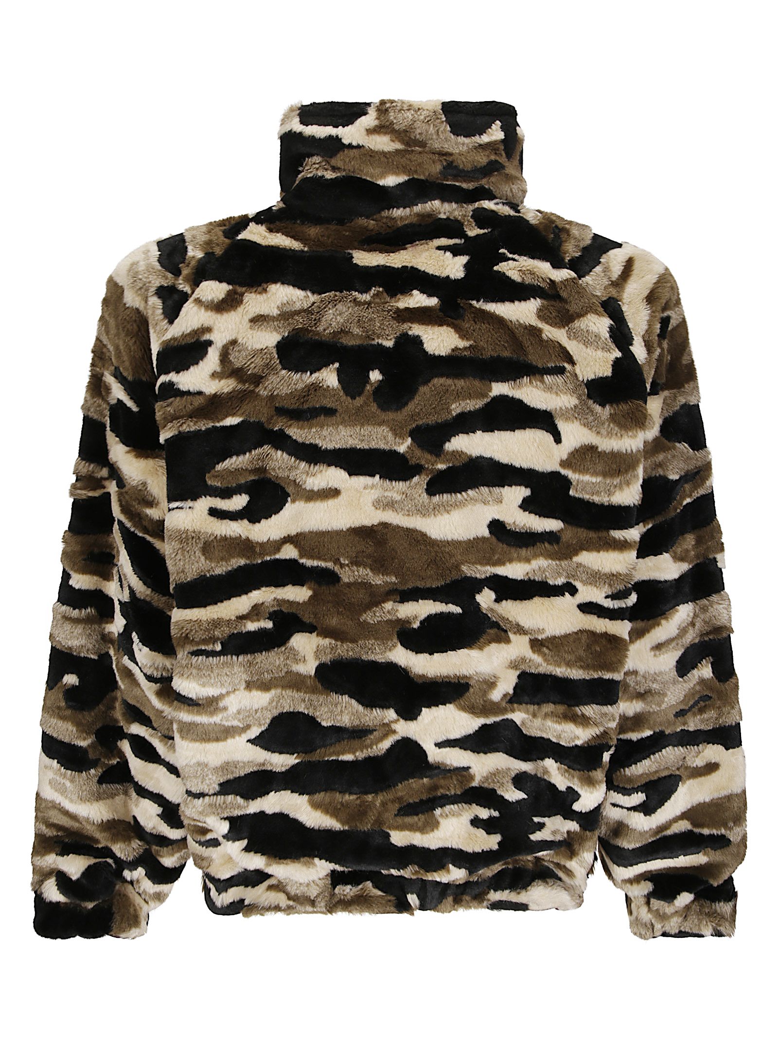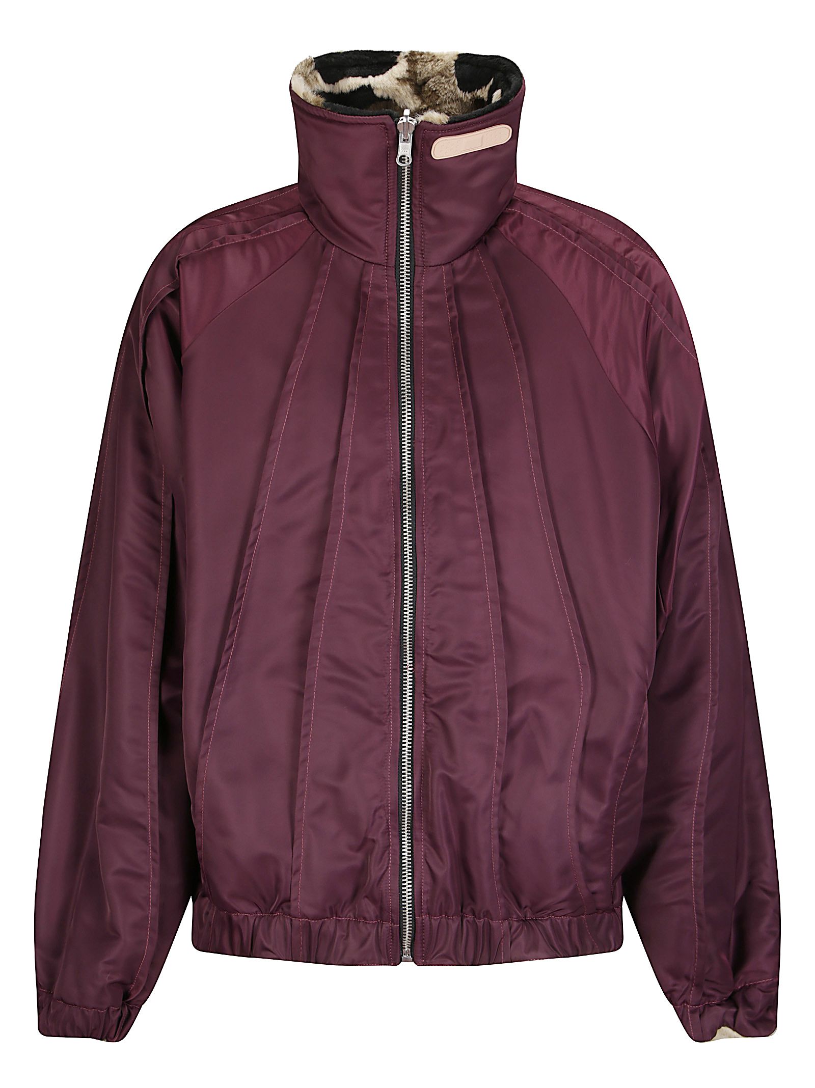 Giacca in finta pelliccia con tasche e cappuccio, utilizzabile anche reversibilmente, fodera interna bordeaux con cuciture a contrasto e tasche, dettaglio con cerotto applicato all'interno del colletto.