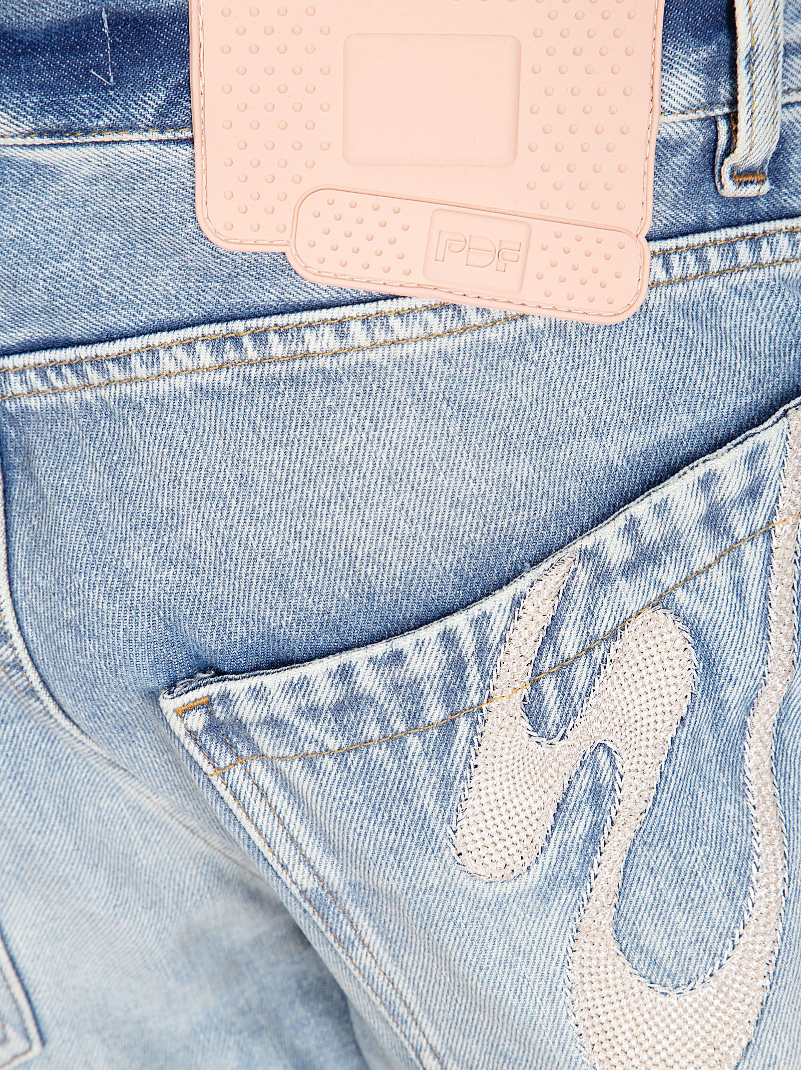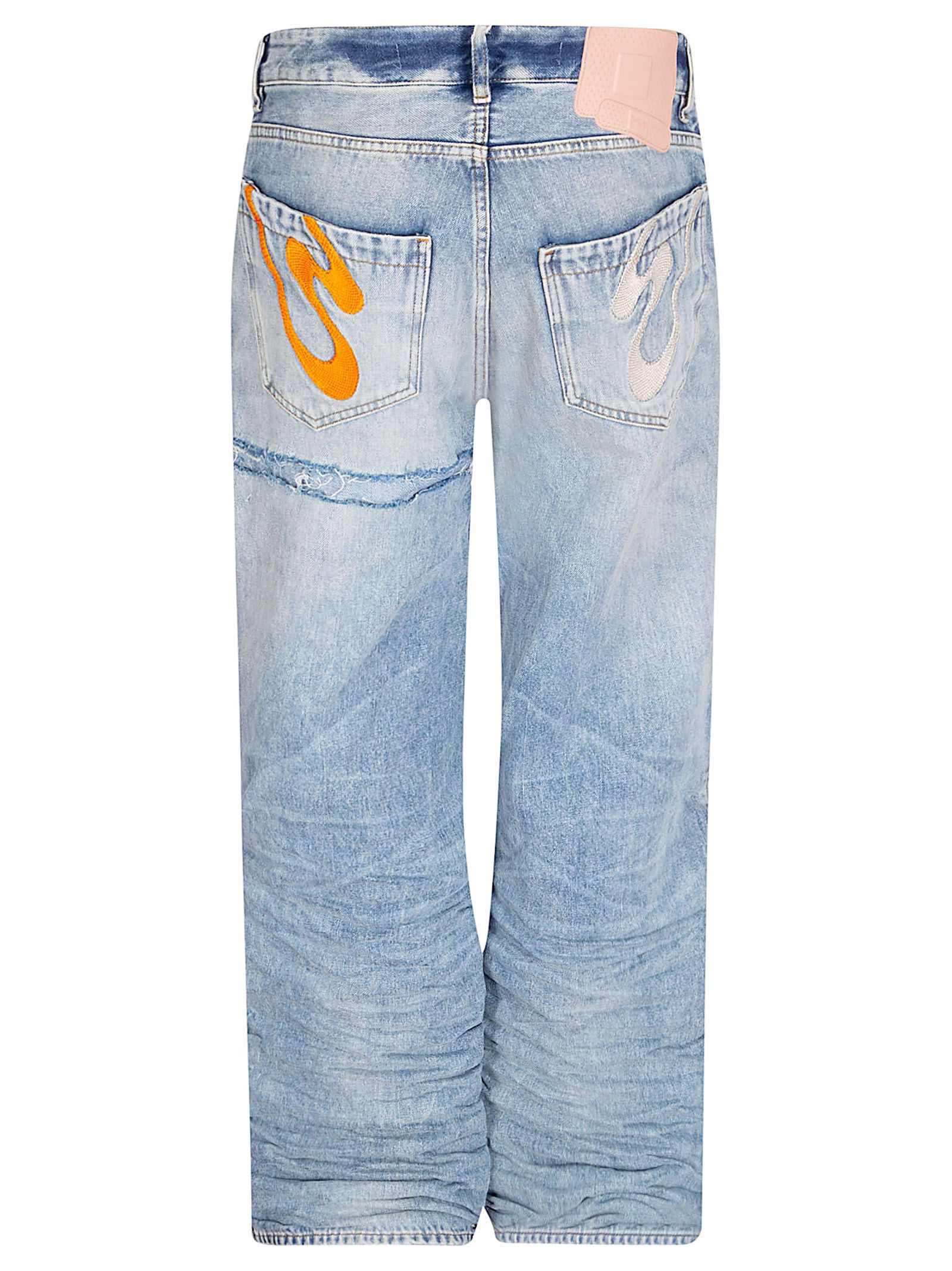 Jeans lavaggio acido, modello Rich Kid, gamba dritta oversized con tagli ampi, cuciture e dettagli a contrasto sul retro.