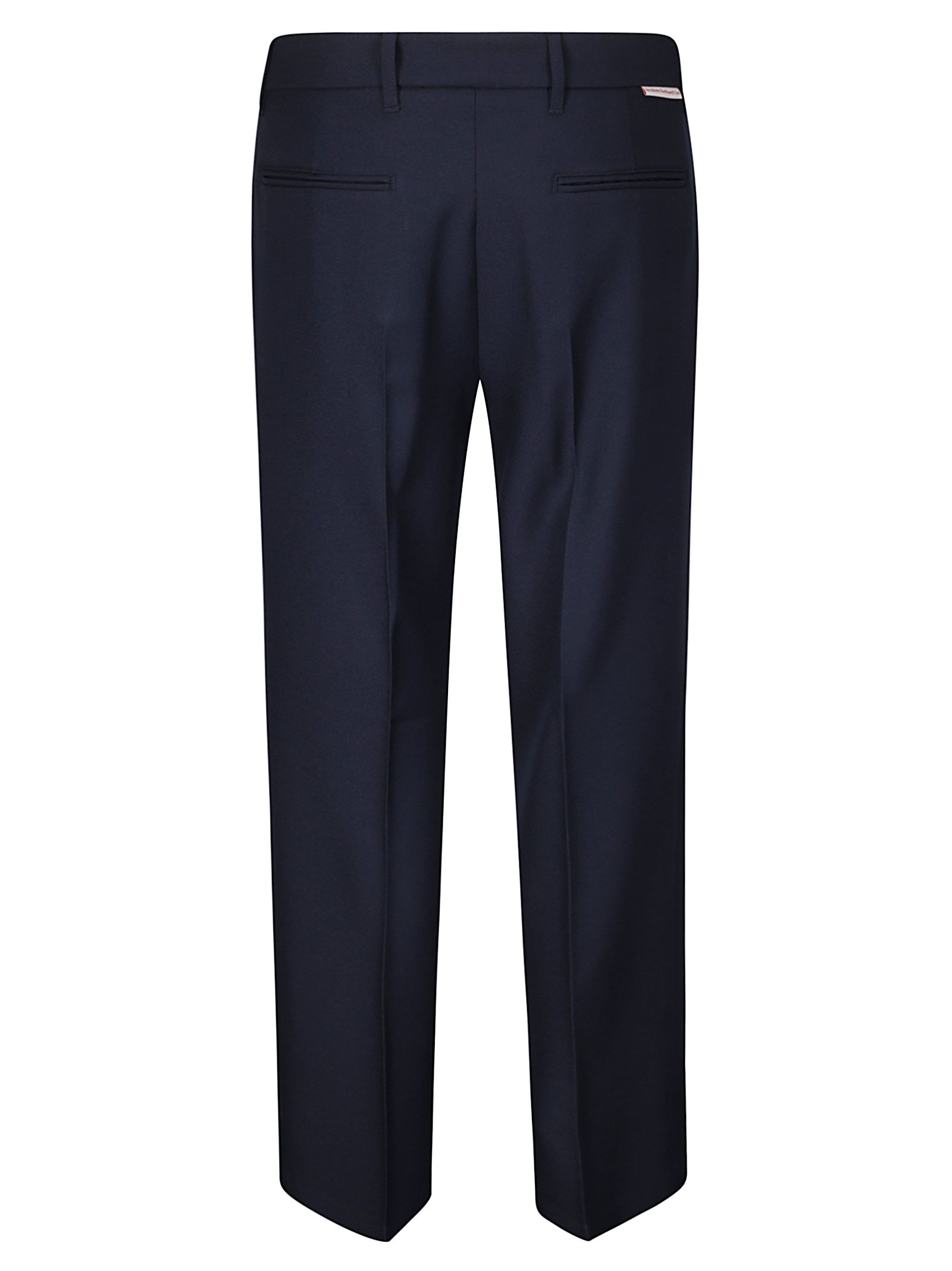 Pantaloni gamba dritta, tessuto in twill, piega stirata, due tasche diagonali laterali e due tasche posteriori.