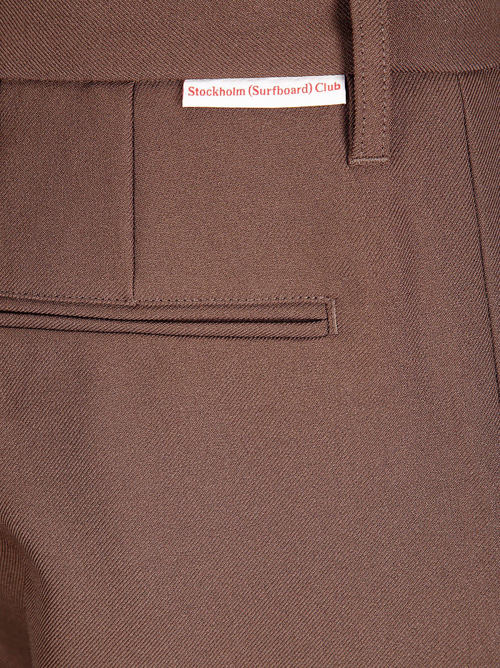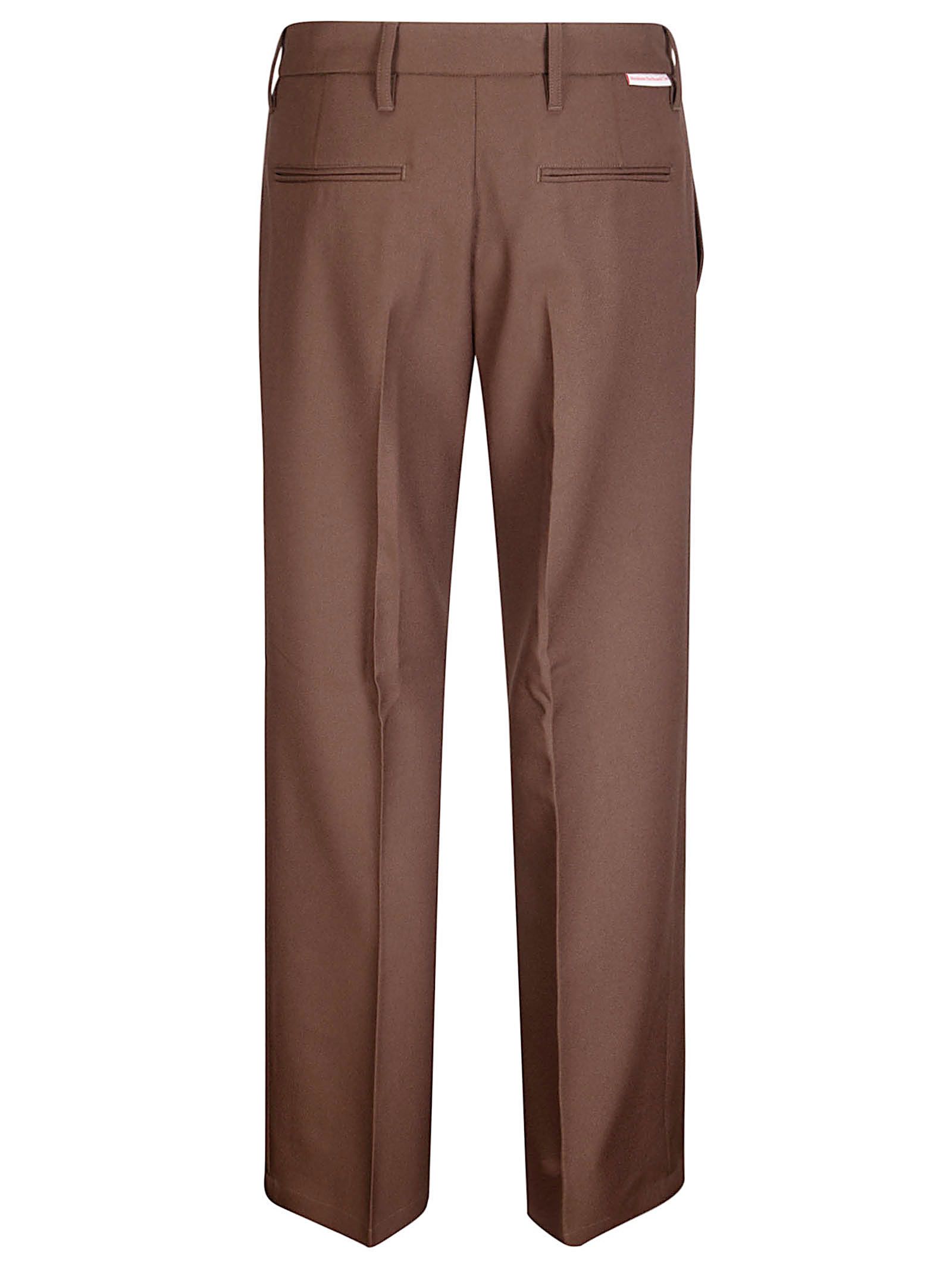 Pantaloni dal taglio sartoriale, tessuto sintetico, righe frontali, chiusura con bottoni e zip, gamba dritta.