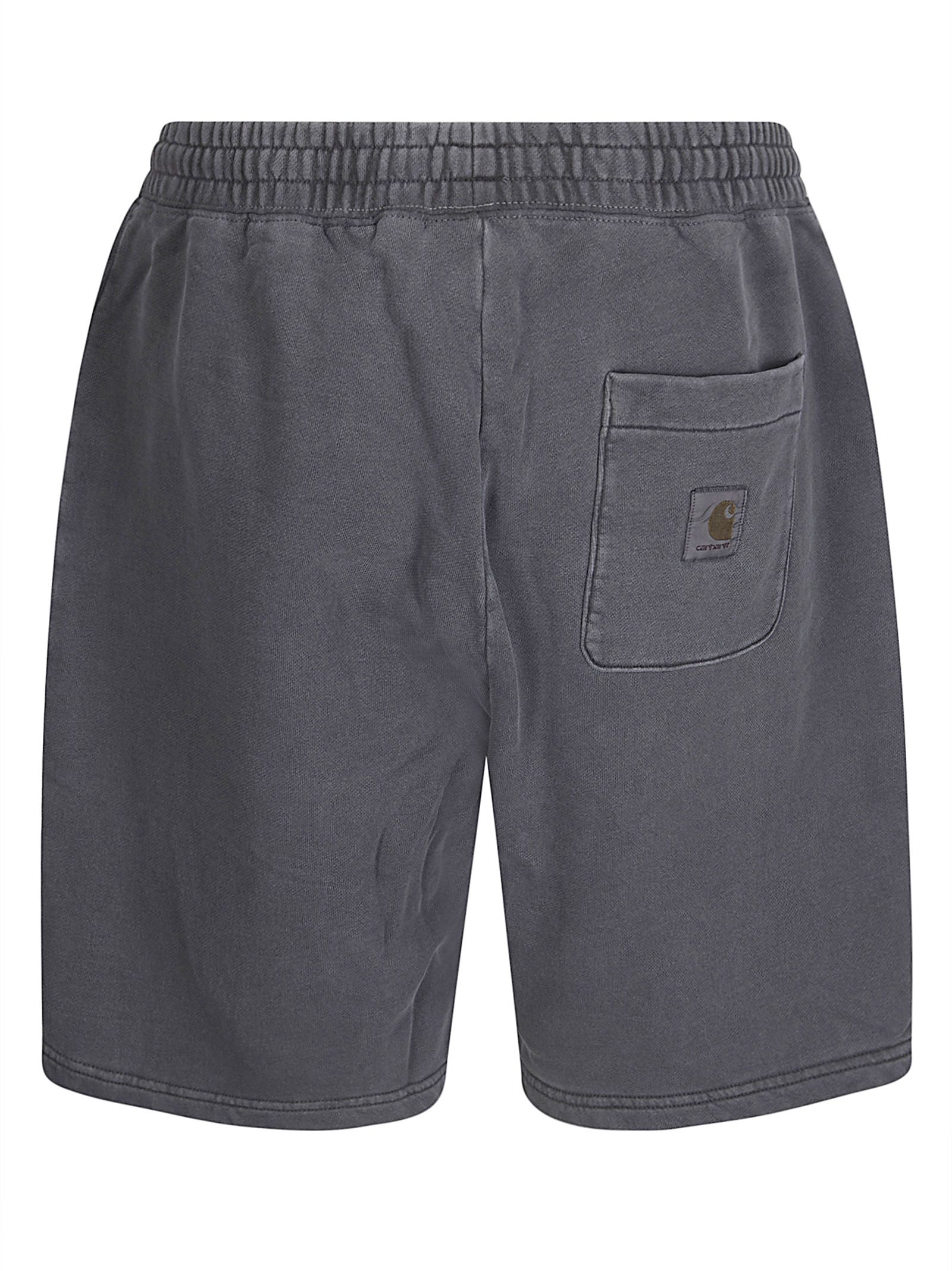 Pantalone corto con vita elasticizzata e coulisse, due tasche laterali, una tasca posteriore, dettaglio etichetta logo sul retro.