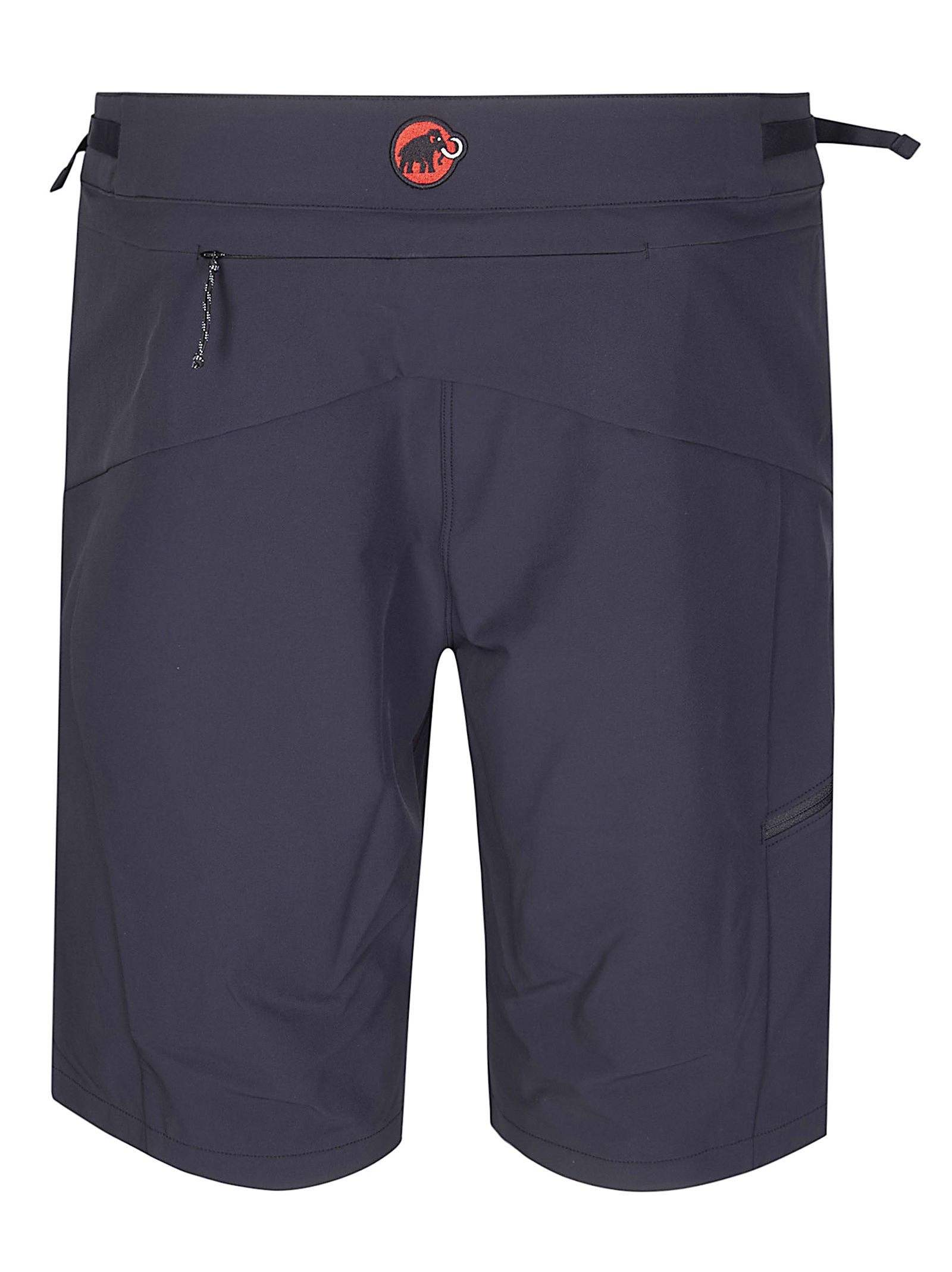 Pantaloni corti in tessuto elasticizzato, chiusura con zip e bottoni, tasche frontali con zip, una tasca centrale posteriore con zip, fettuccia regolabile in vita.