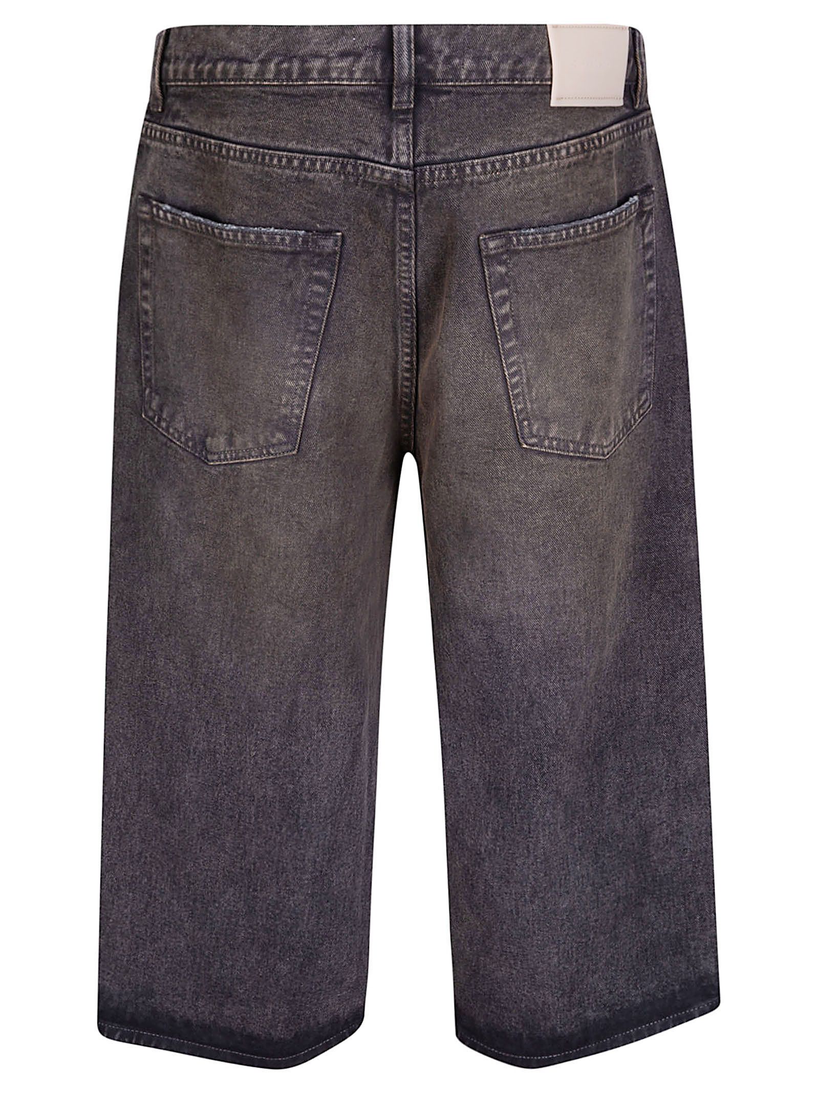 Jeans corti in denim, cinque tasche, vita con passanti, chiusura con bottone e zip, orlo dritto, vestibilità over.