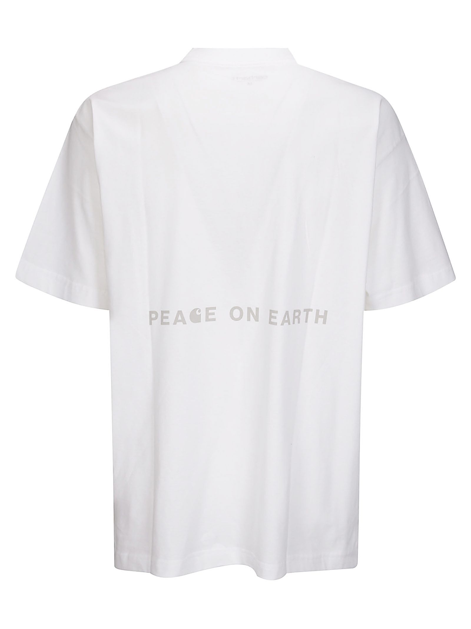 T-shirt girocollo, mezze maniche, stampa frontale, stampa sul retro, vestibilità ampia.