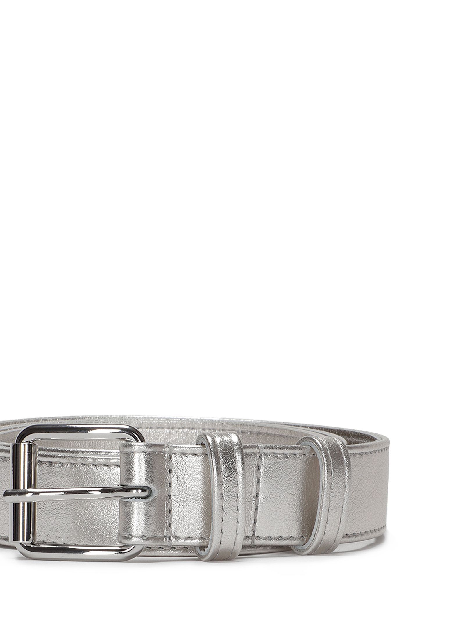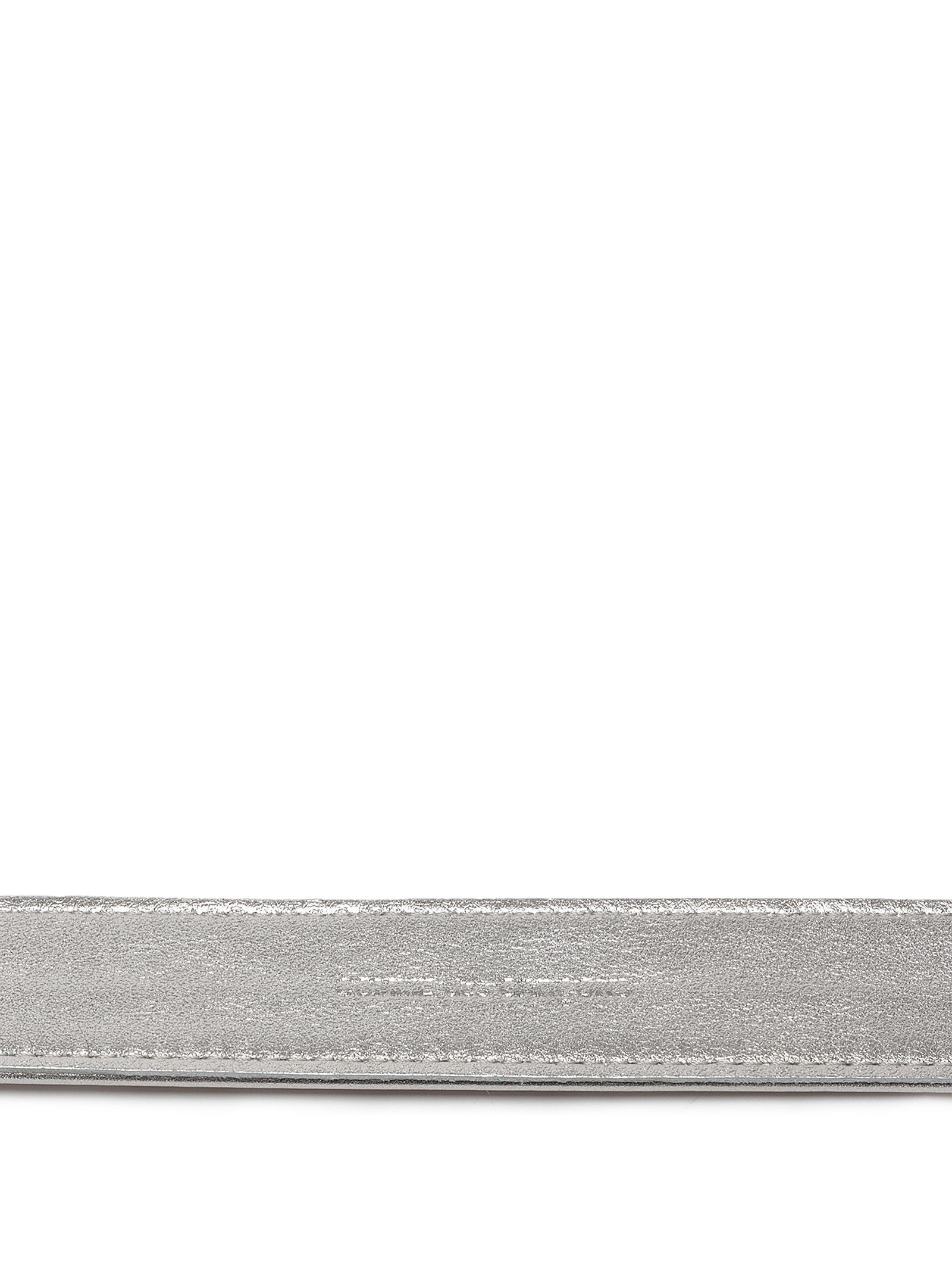 Cintura in pelle effetto metalizzata, fibbia color argento, logo interno inciso, altezza 3 cm.