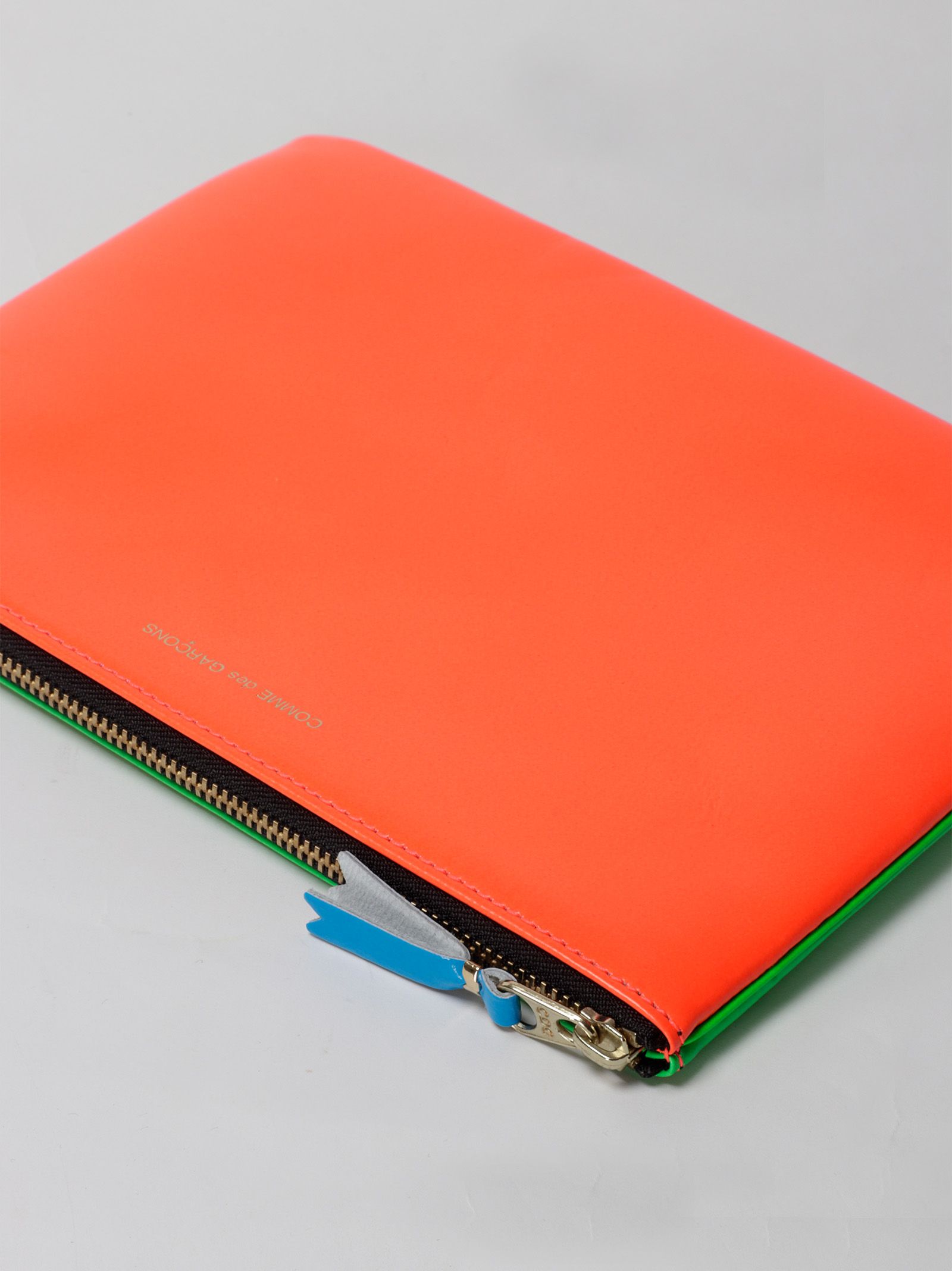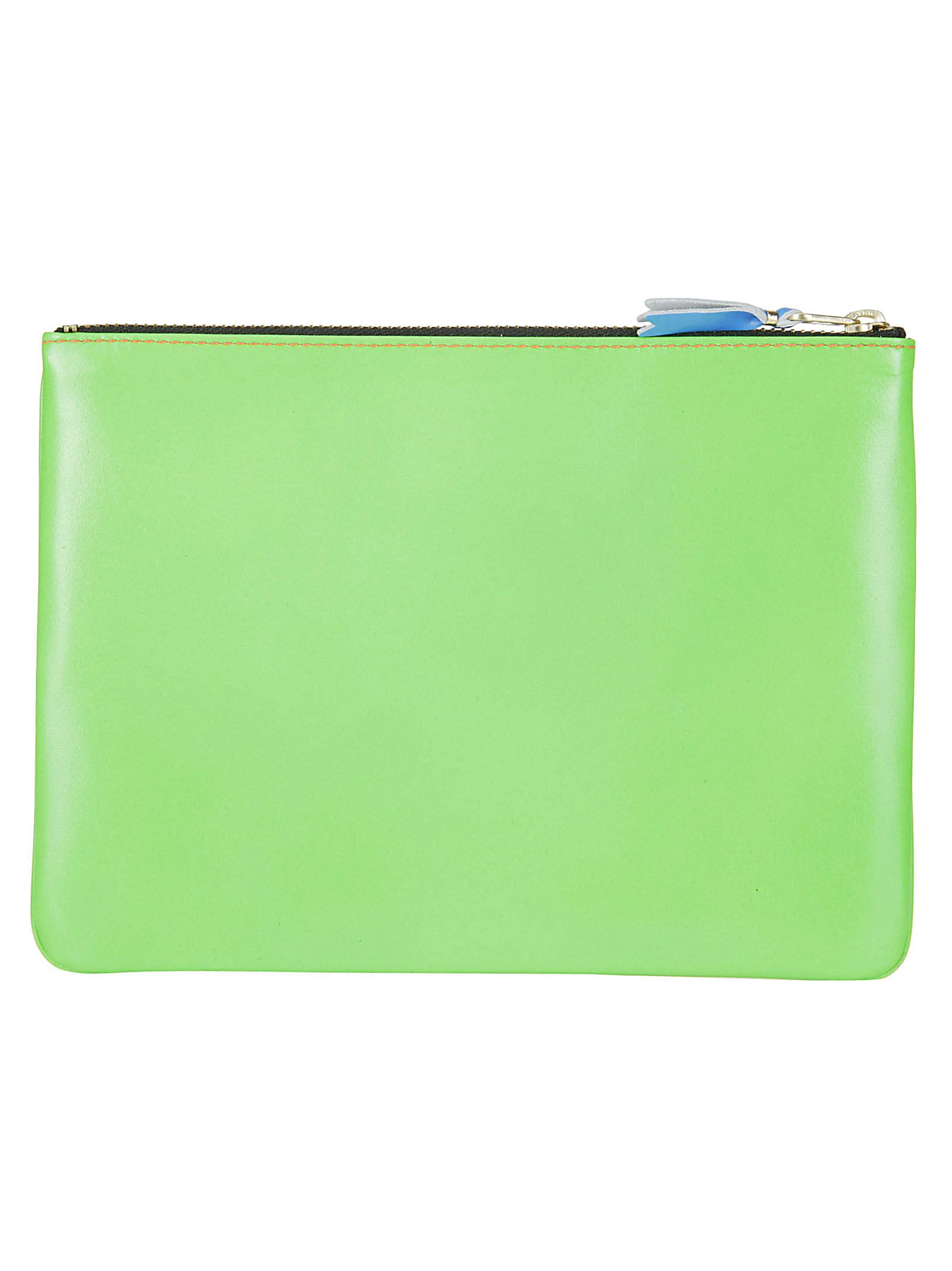 Wallet grande a blocchi di colore, zip con linguetta azzurra, logo oro a contrasto.
