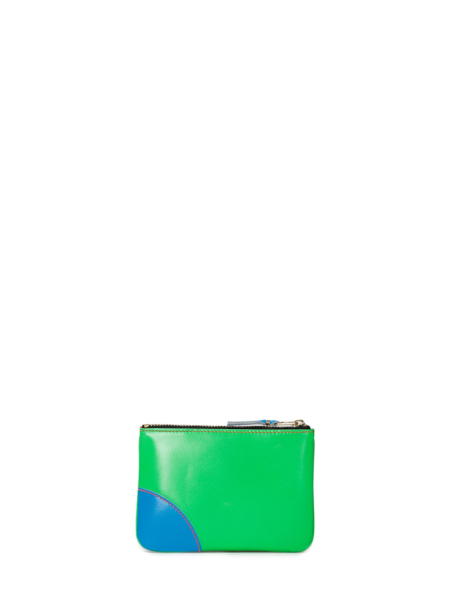 Wallet a busta con logo oro a contrasto, color block fluo, zip con linguetta azzurra.