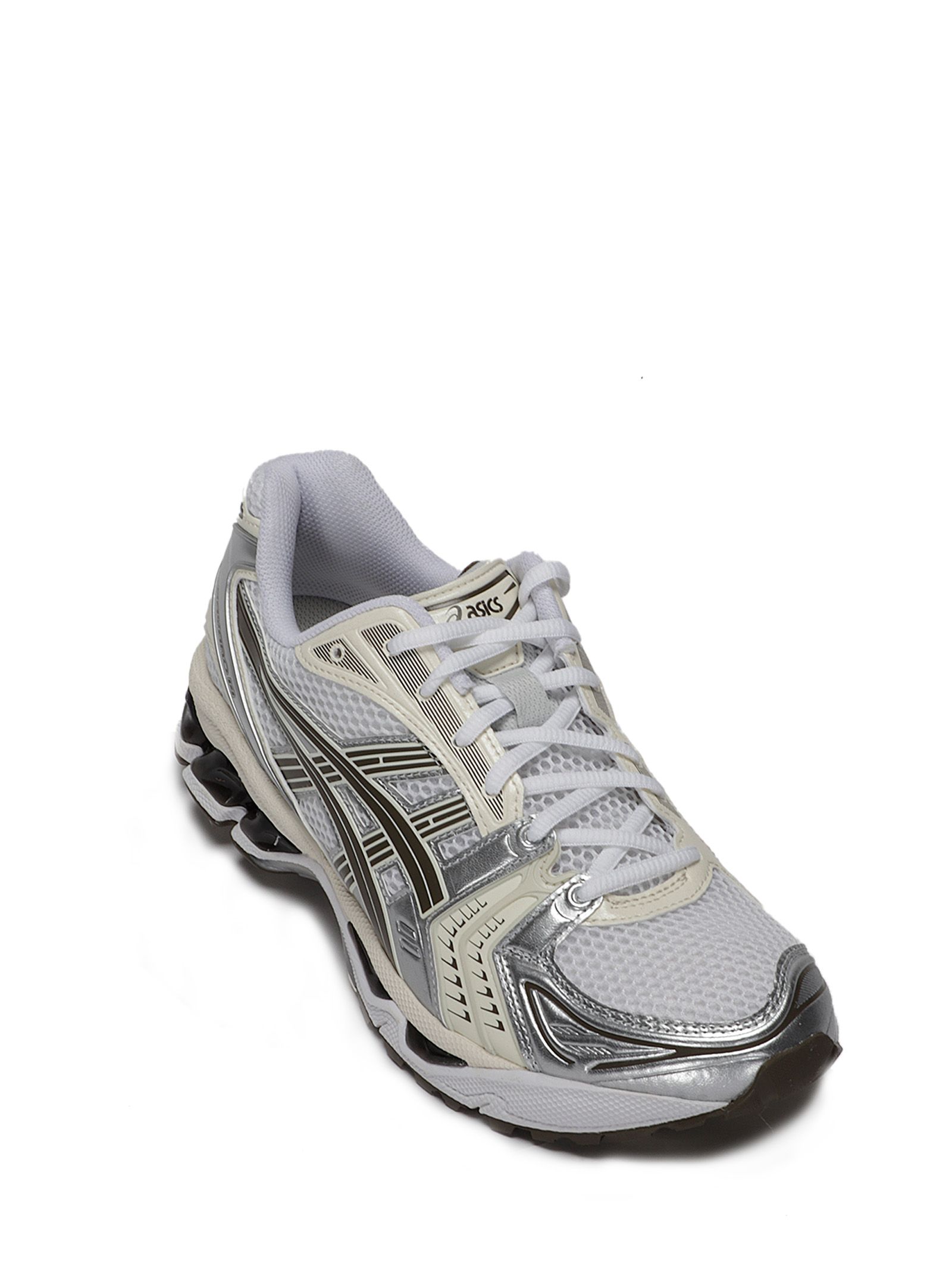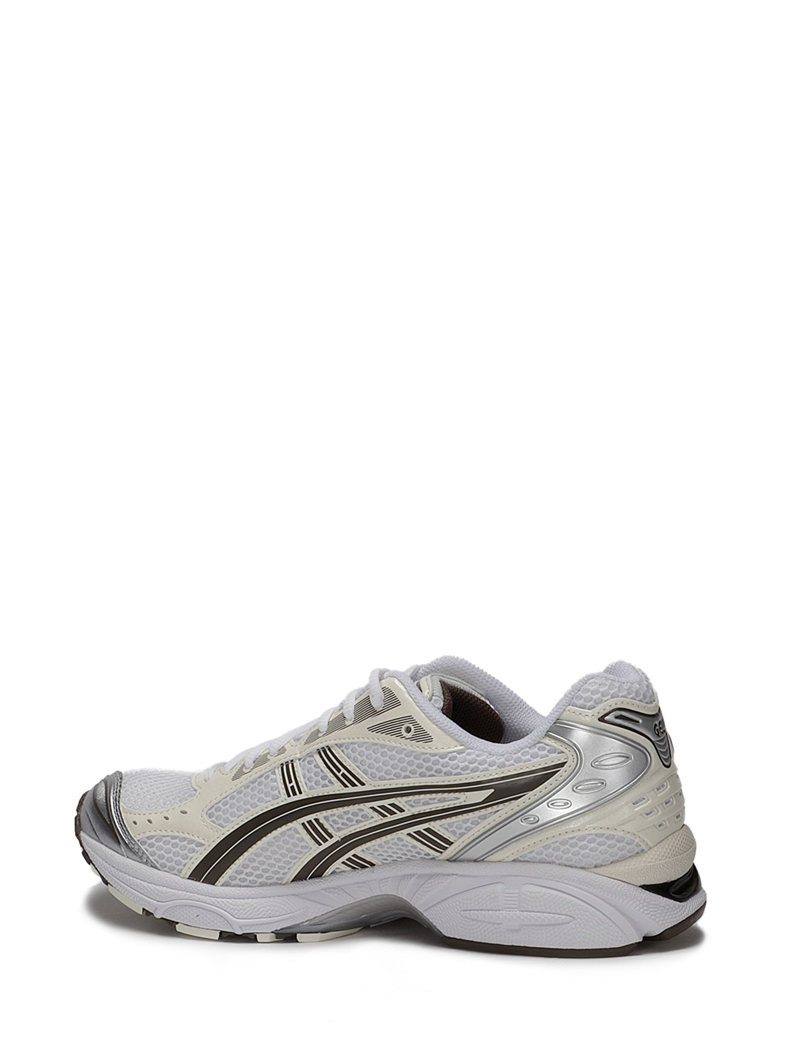 Sneakers multicolor con dettagli argento, bianco, scritta GEL posteriore, suola a contrasto, lacci in tessuto.