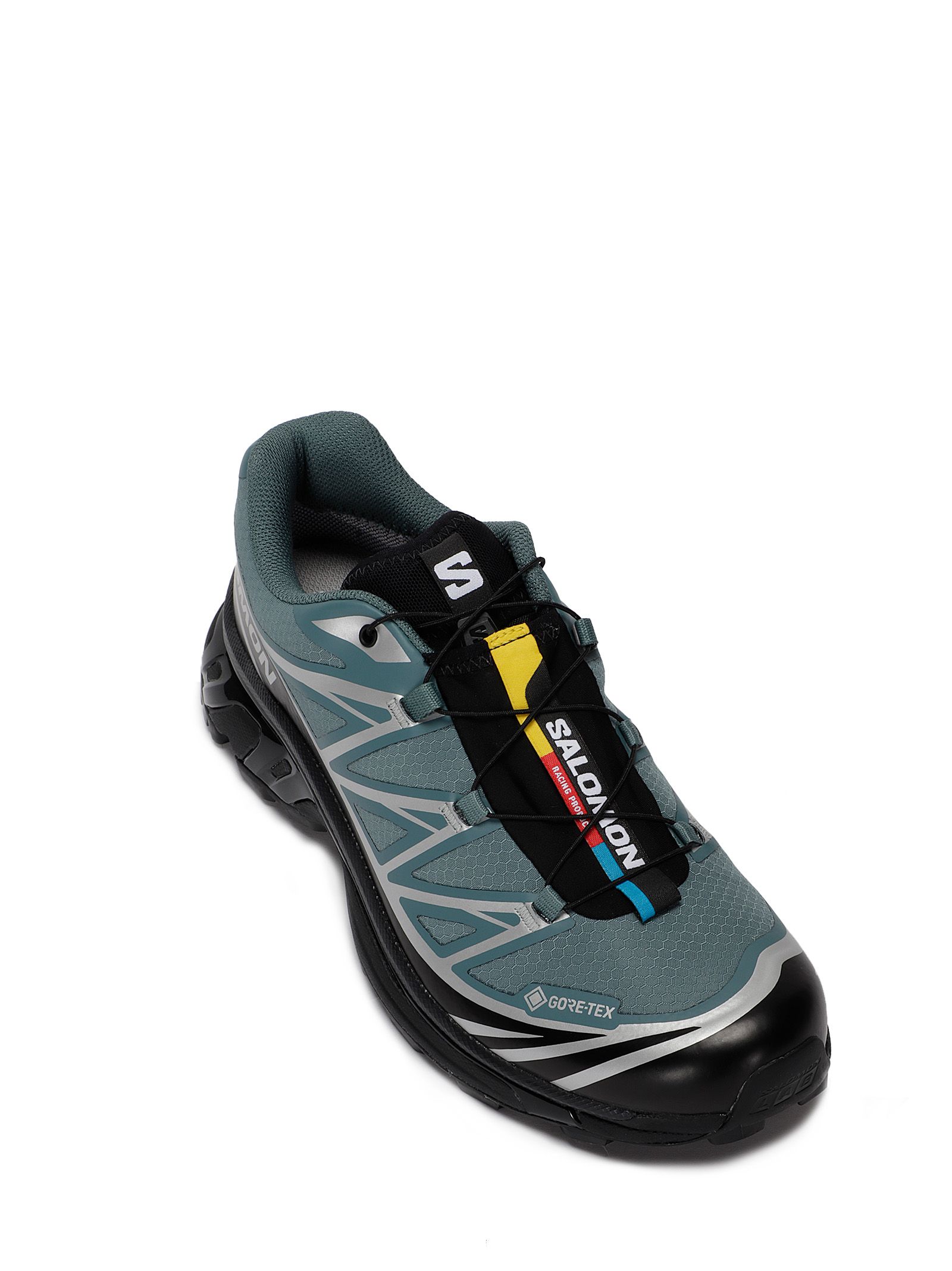 Sneakers XT-6 nere e verdi con dettagli argento, laccio Quicklace nascondbile, logo Salomon grande, Gore-Tex.