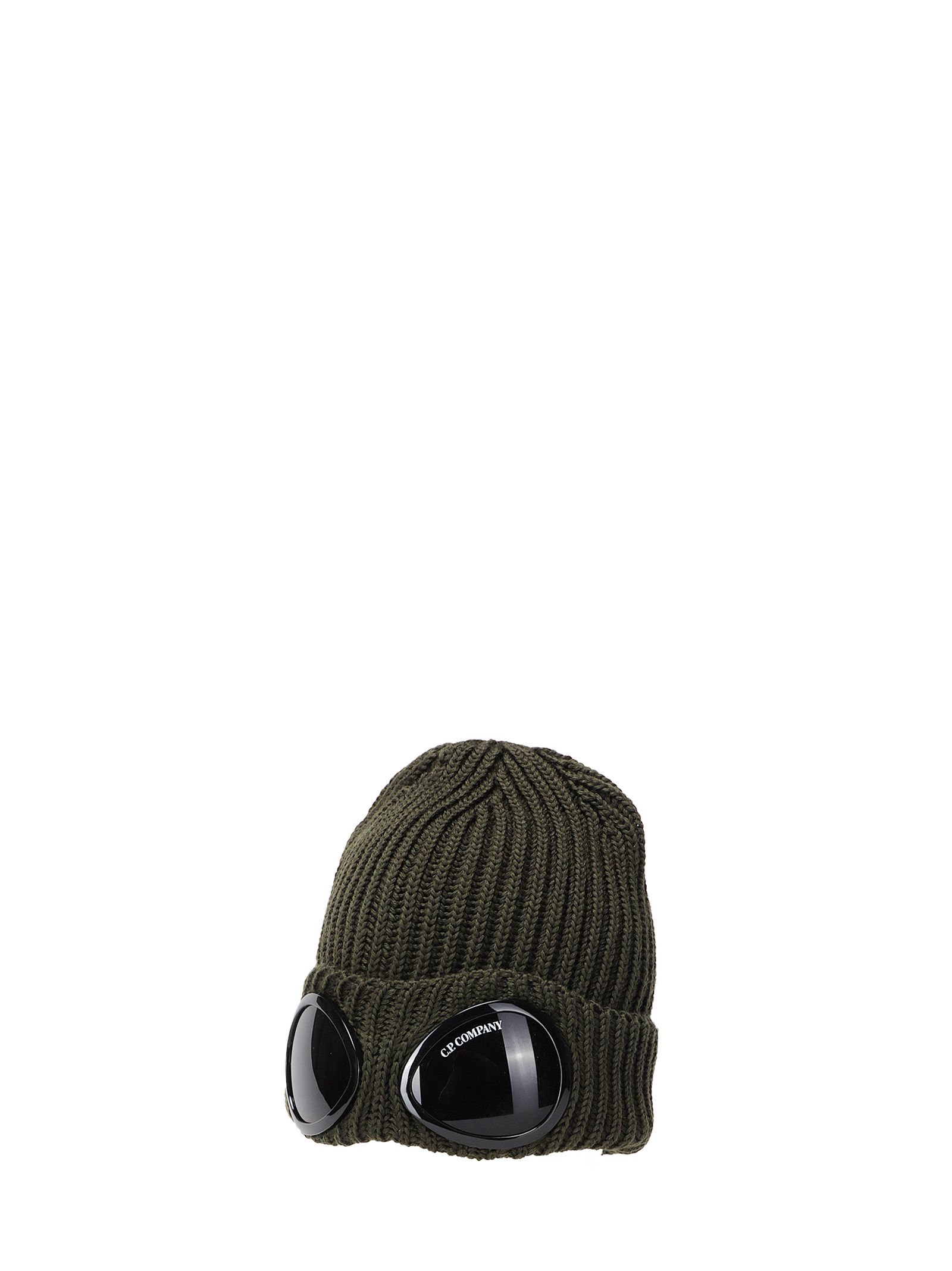 Berretto con occhiali in lana merino extra fine, risvolto sulla visiera, lavorazione a coste.