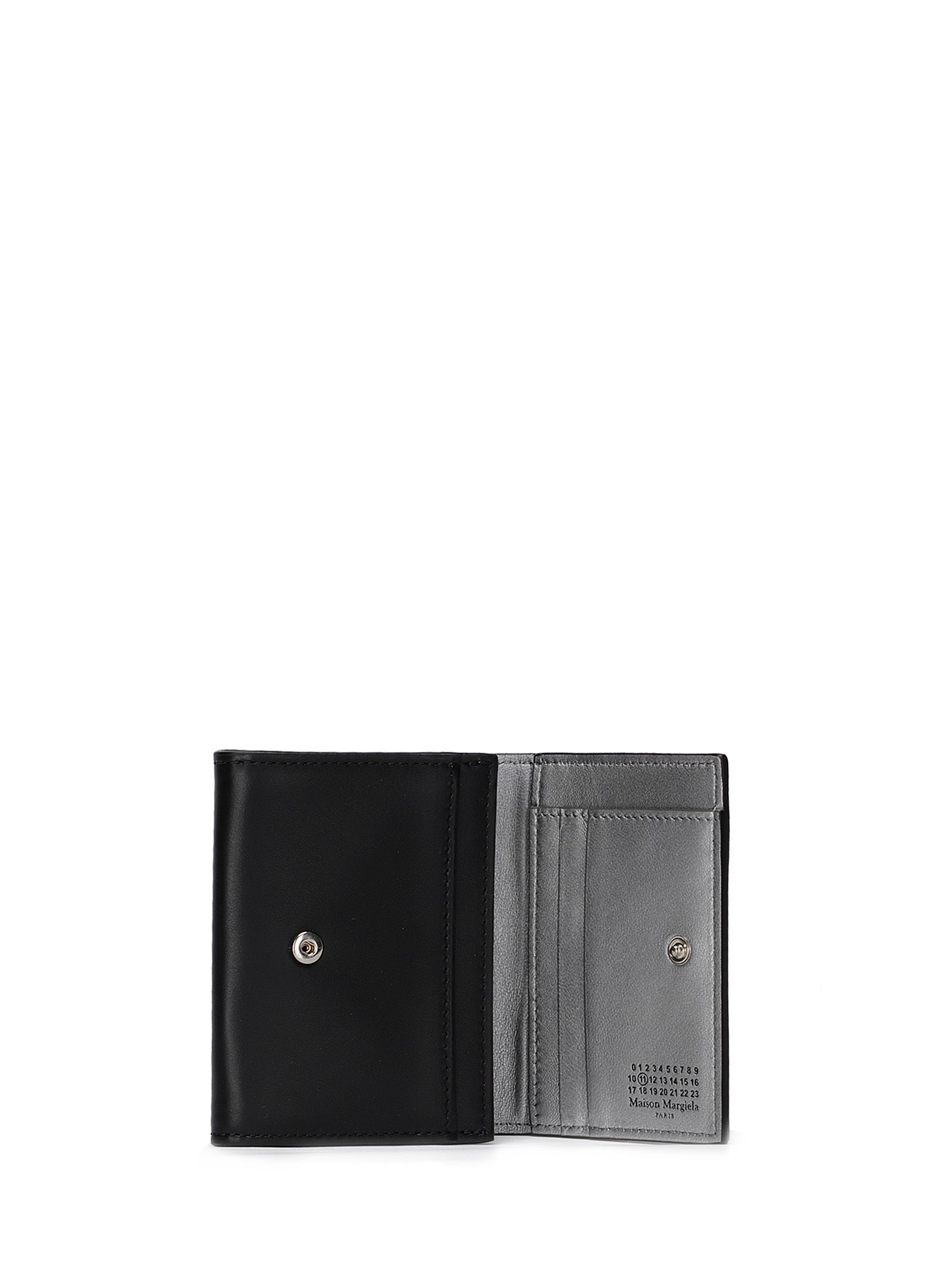 Portafoglio compatto nero, stampa logo frontale, chiusura con bottone a pressione, tre slot portacarte e tasca interna con zip portamonete.