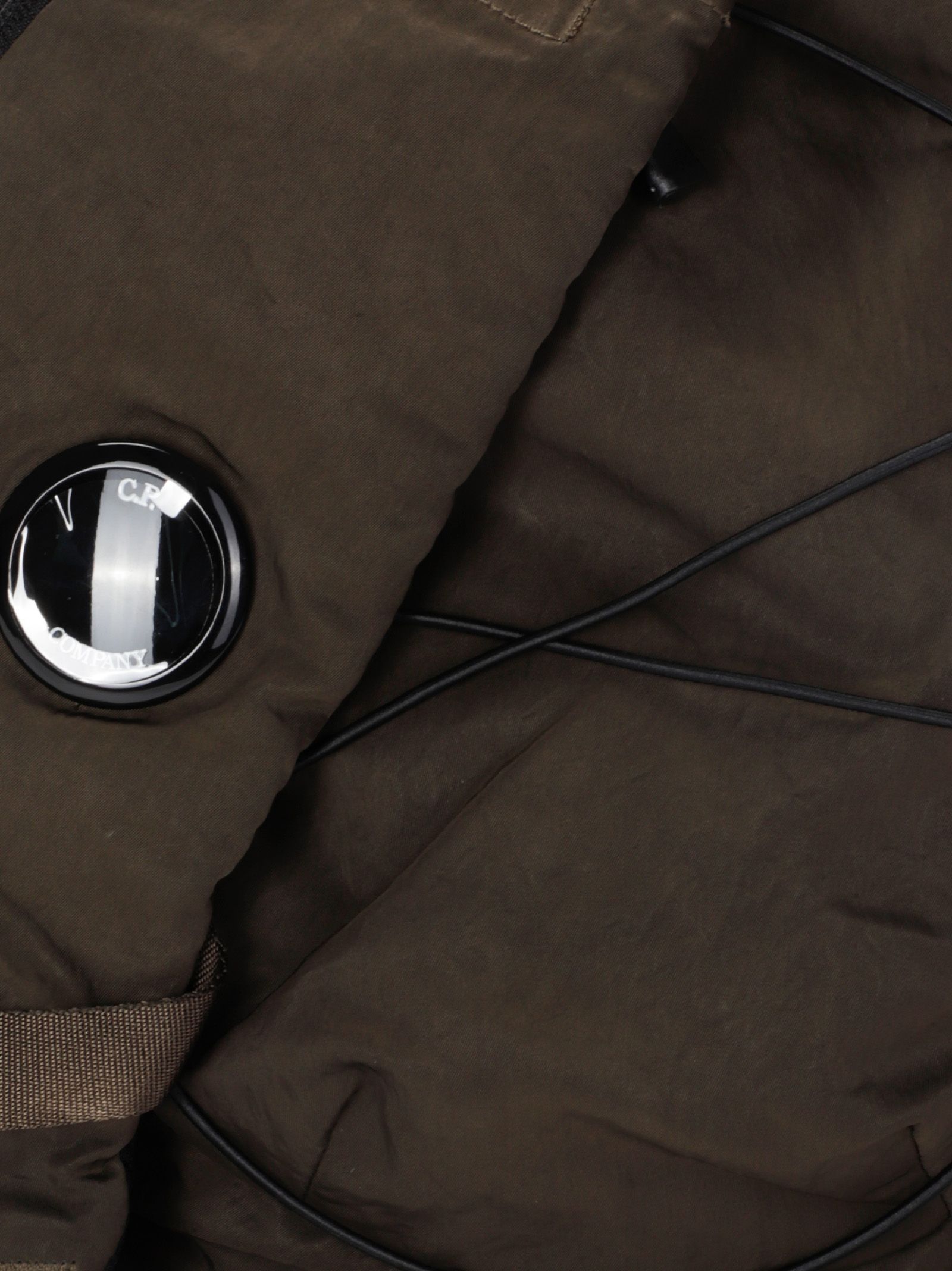 Zaino a tracolla in Nylon B, multi-filamento lavorato a raso, caratterizzato da Lente, tinto in capo trattato anti-goccia, spallaccio e buckle regolabili, tasche sul retro con zip e velcro.
