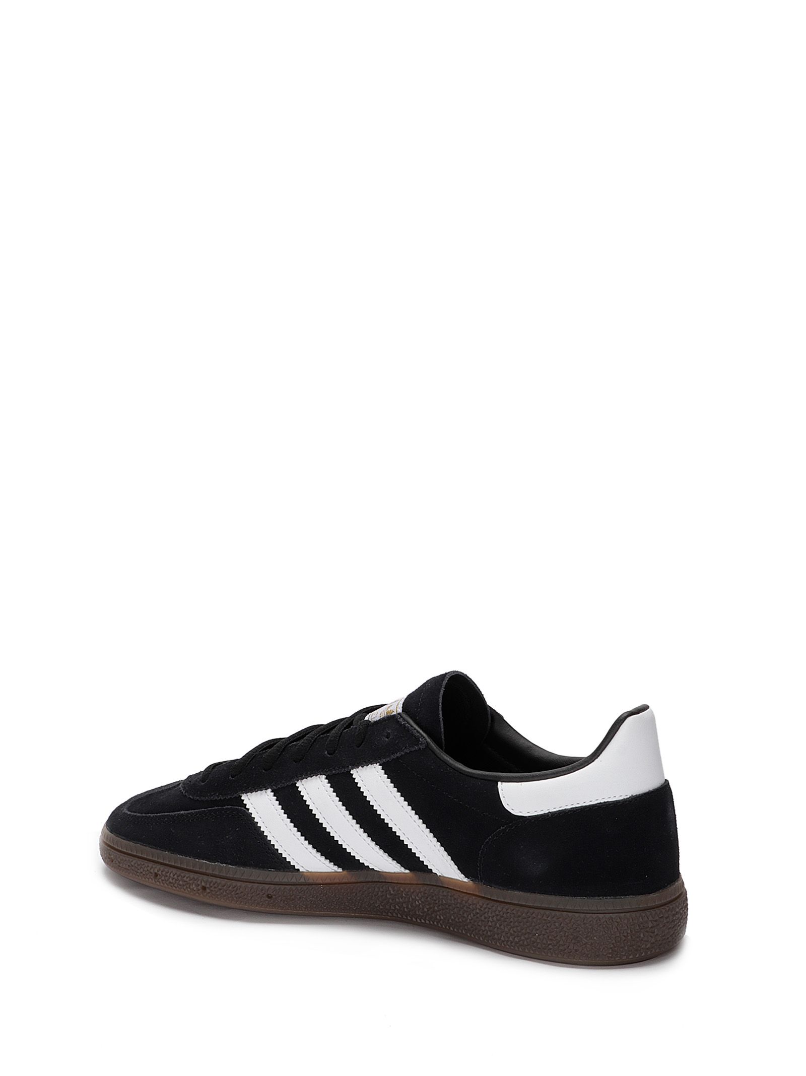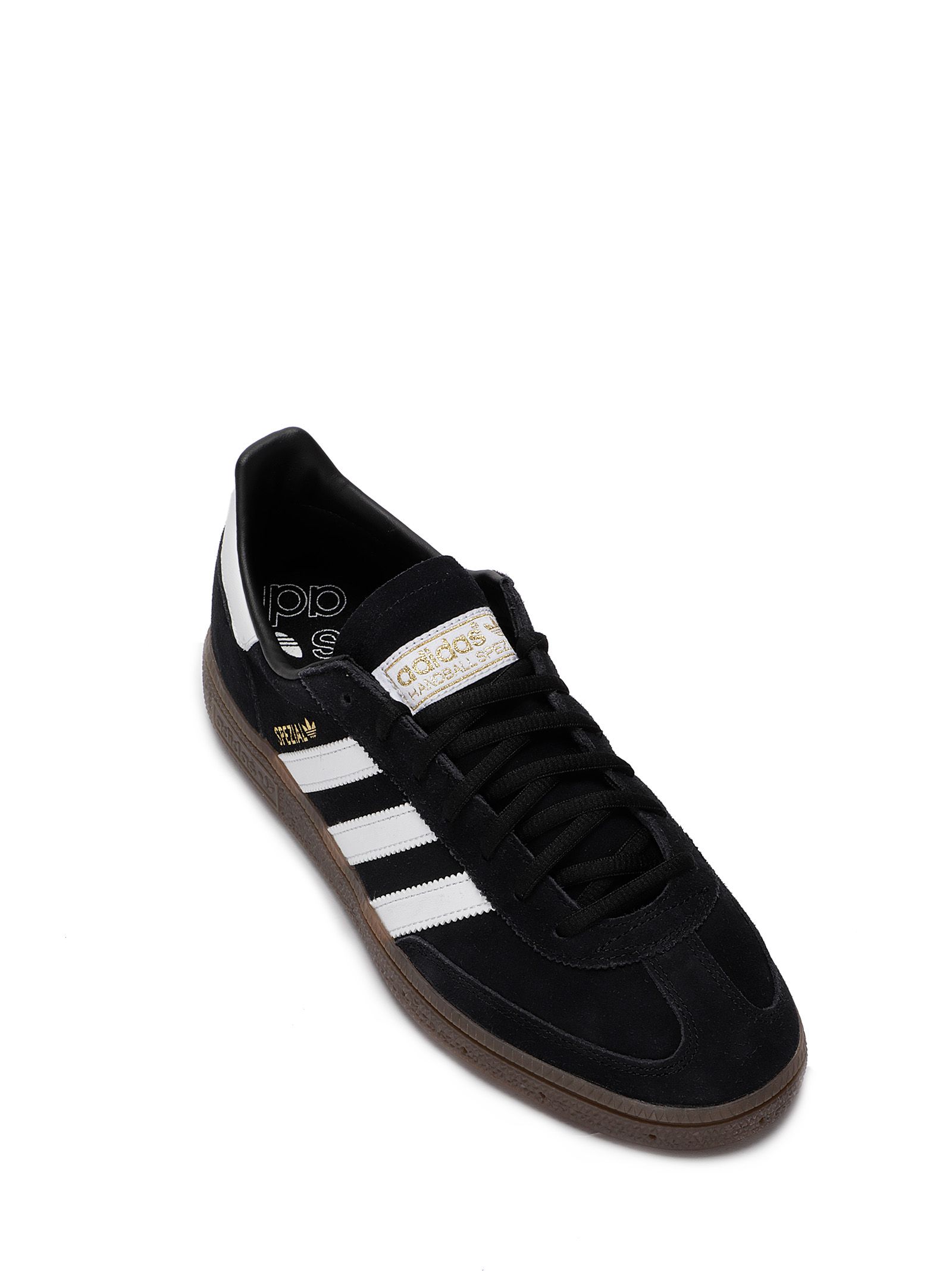 Sneakers Handball Spezial nere con barre laterali e tallone posteriore bianco a contrasto, logo laterale oro, suola in gomma a contrasto marrone.
