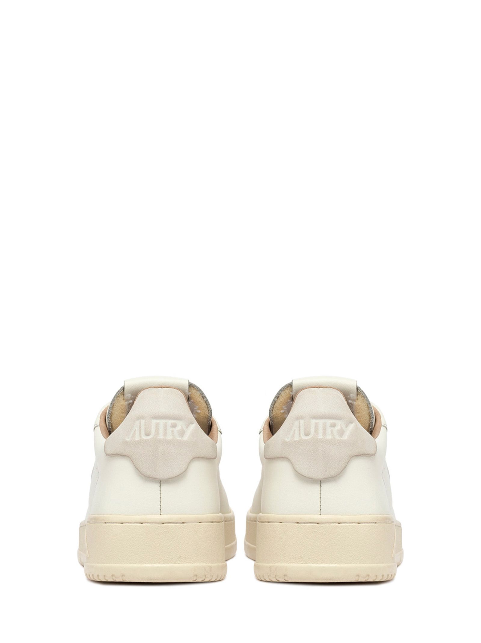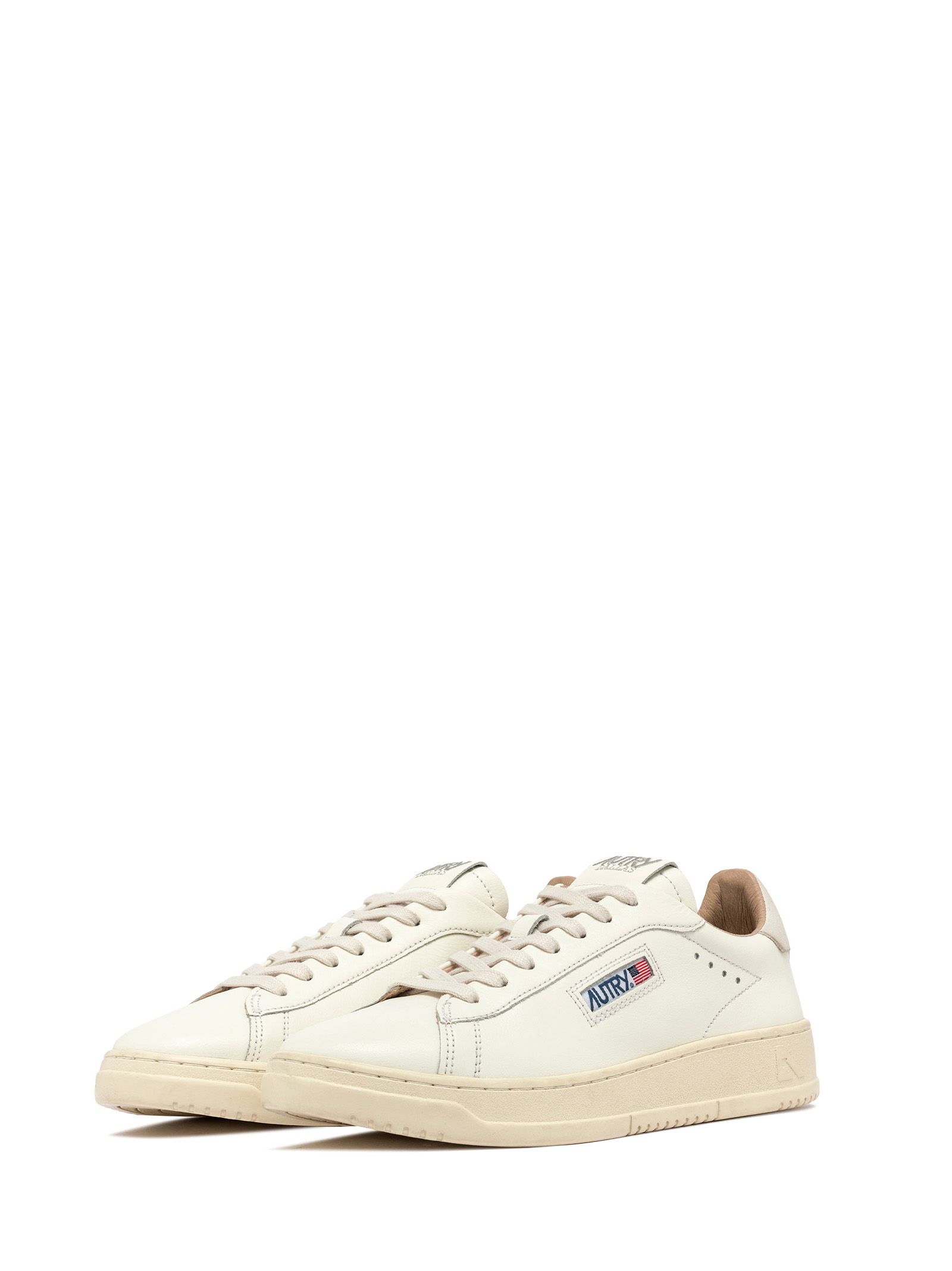 Sneakers in pelle bianca con suola in gomma a contrasto, tallone bianco, interno marrone chiaro, logo laterale.
