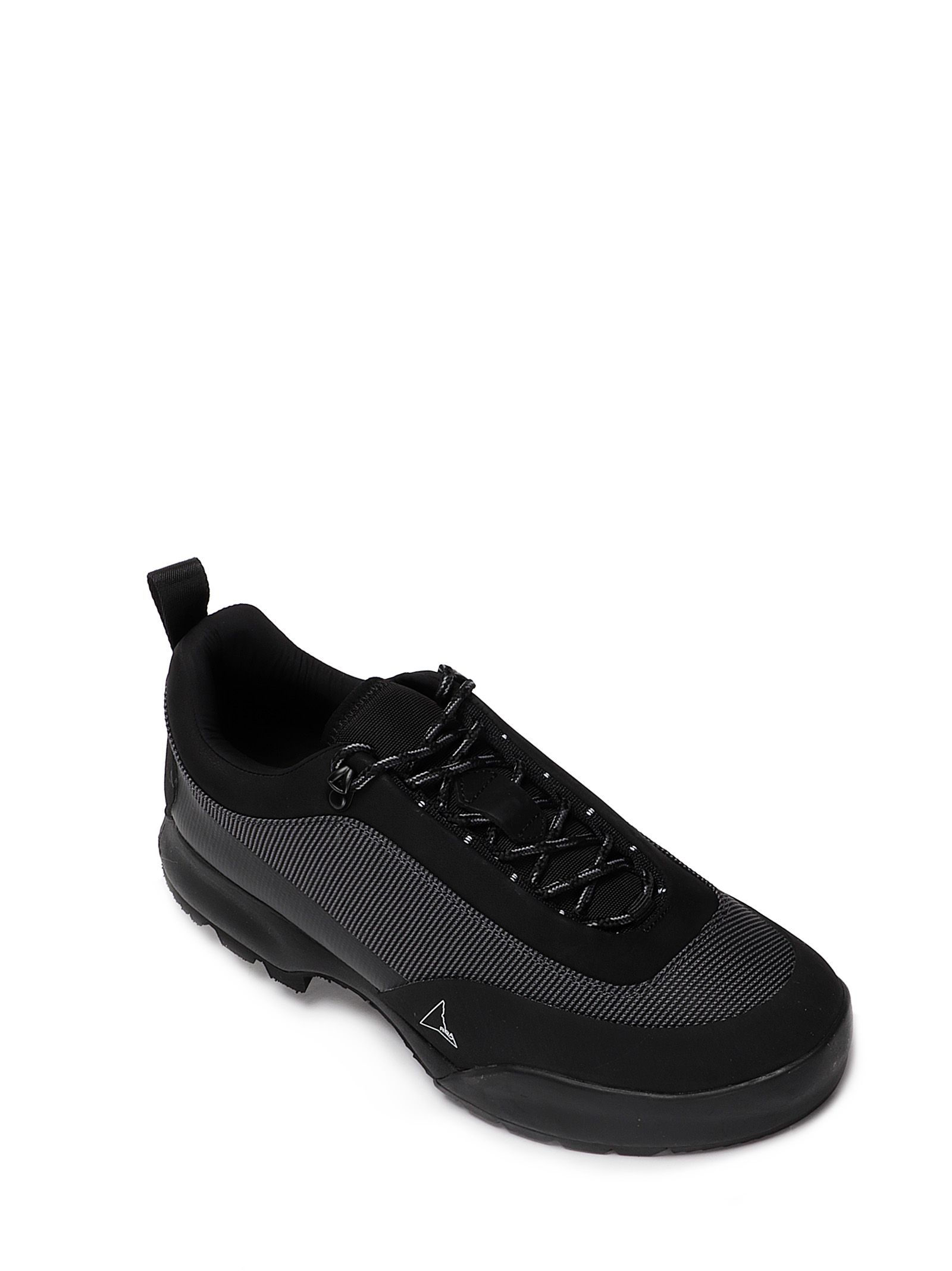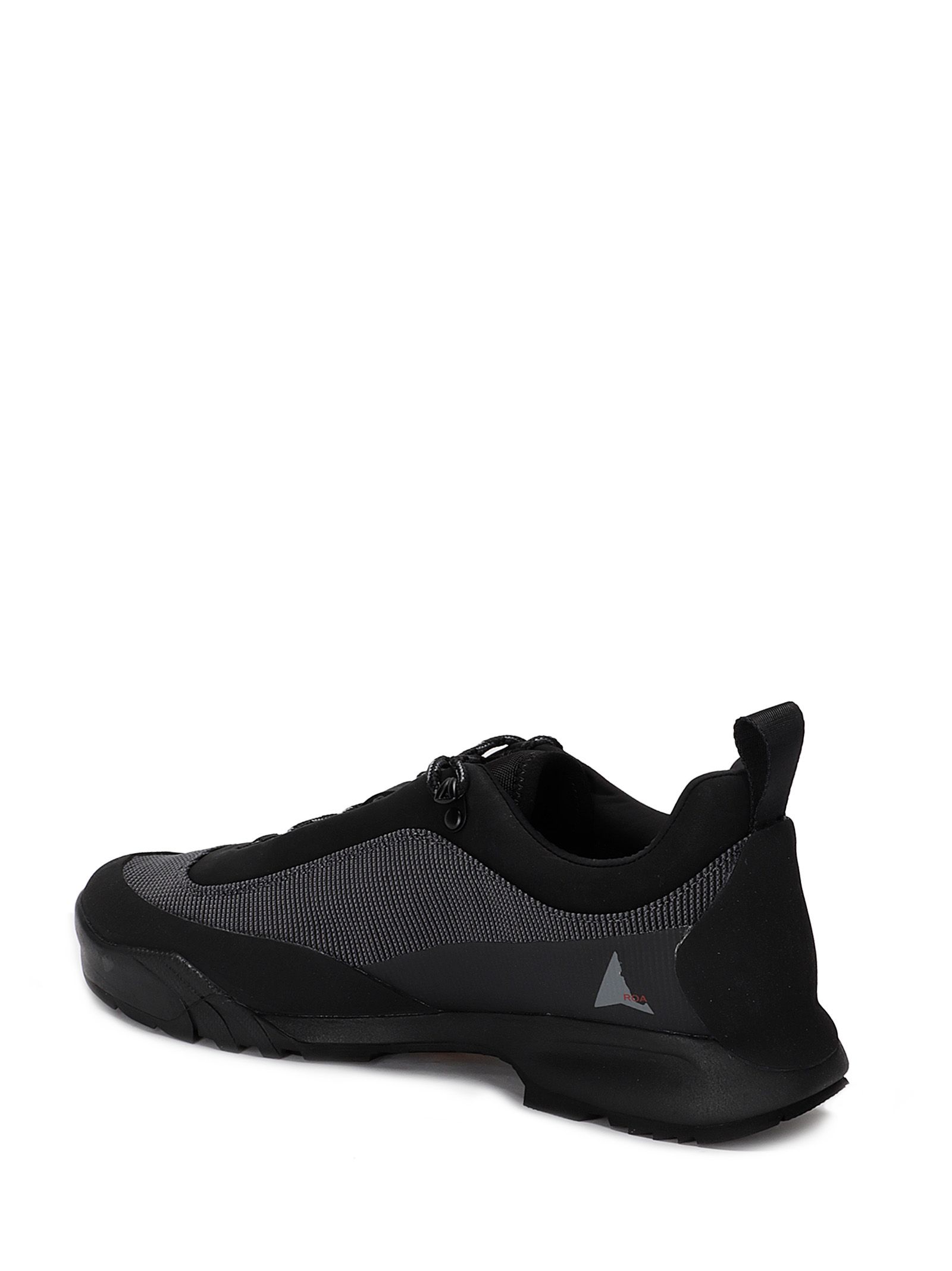 Sneakers nere con ricami grigi laterali, logo Roa, suola a contrasto, linguetta posteriore.