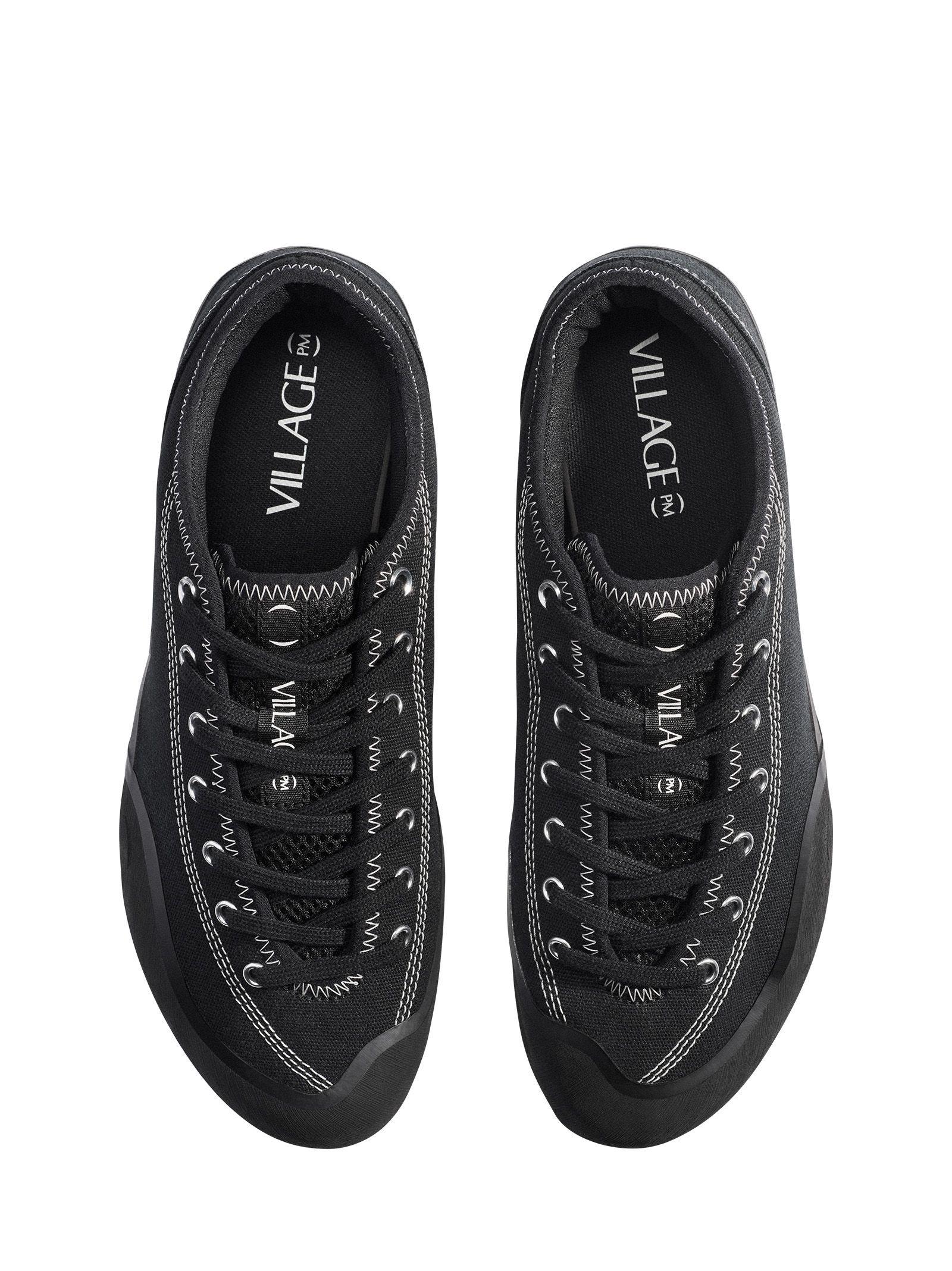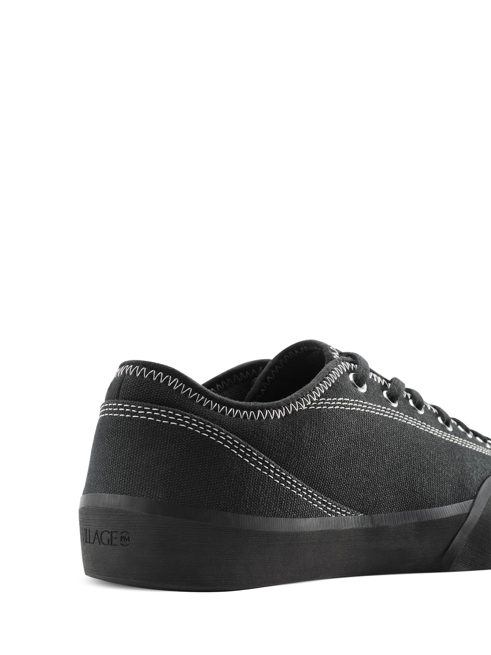 Sneakers basse modello 1.30PM in tela, nero con suola in gomma a contrasto e cuciture bianche, design stile skateboard shoes, lacci in cotone e occhielli argento.